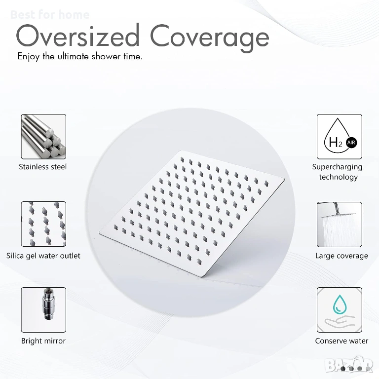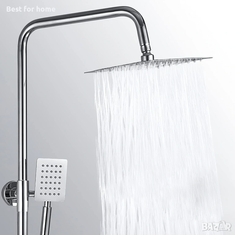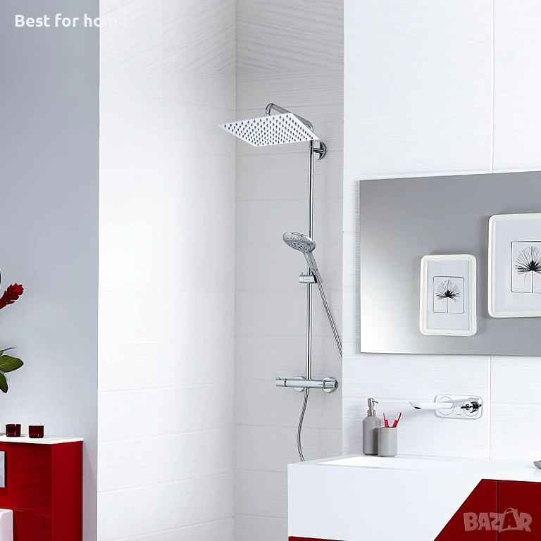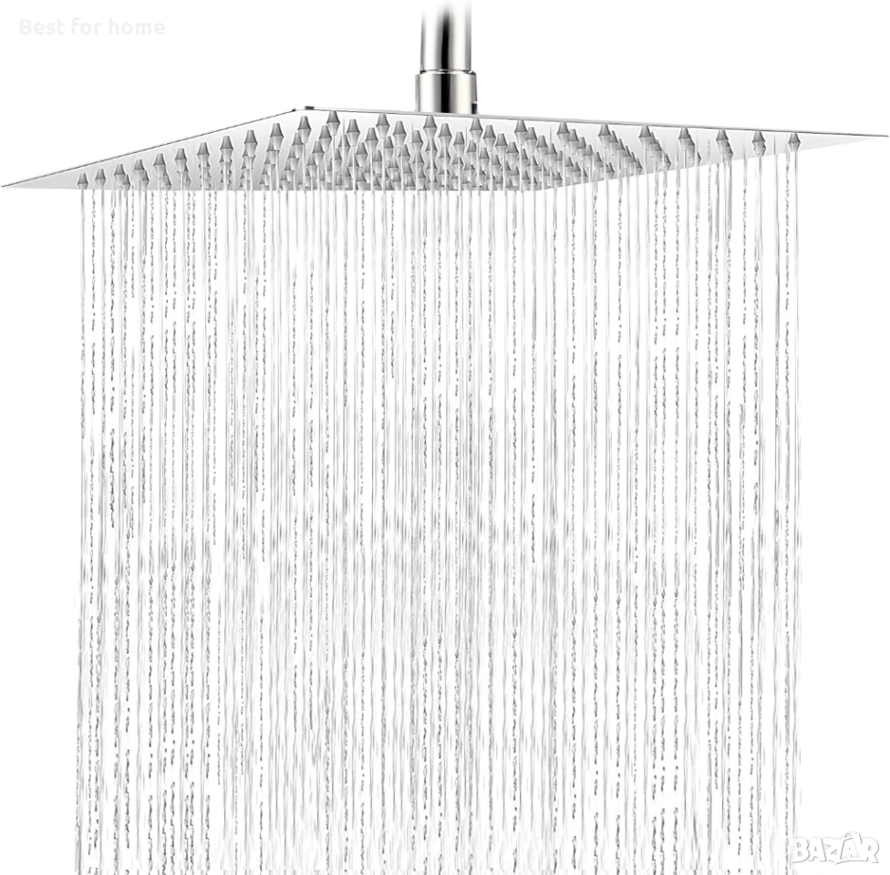 Луксозен дизайн на душ: изключително голяма душ глава тип „тропически дъжд“, ултратънка. Полираната неръждаема стомана създава луксозен огледален ефект.