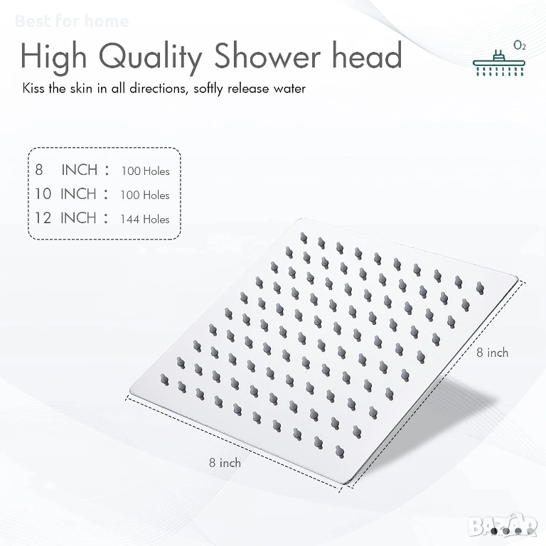 SOLVEX DE-SP-50018 Душ глава тип „Дъжд“, вградена квадратна душ глава с диаметър 8 инча, душ глава тип „Капалит“ от неръждаема стомана, с дюзи против котлен камък, полиран огледален ефект, висок гланц (20 x 20 см).
