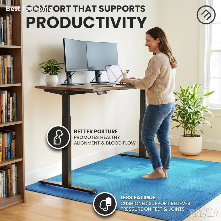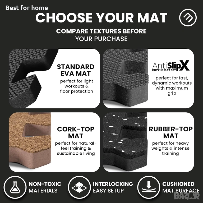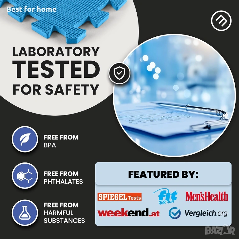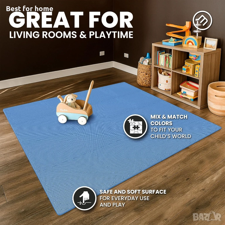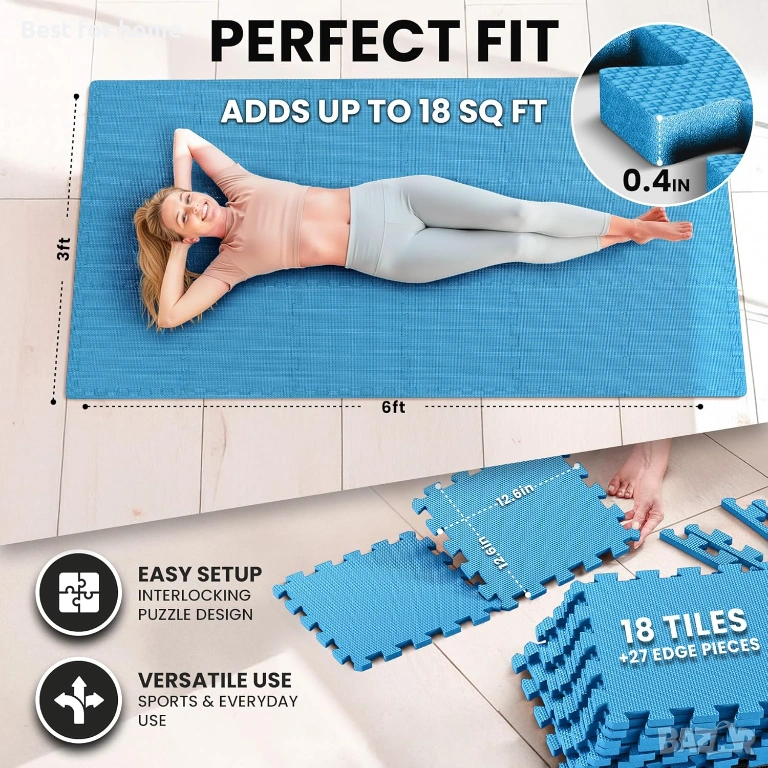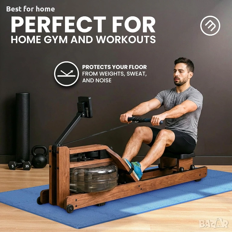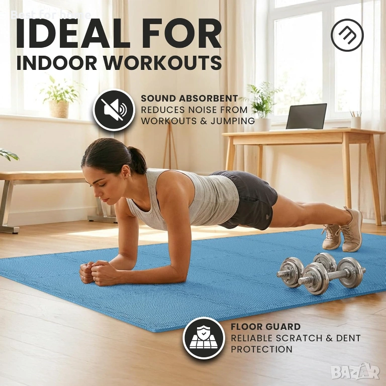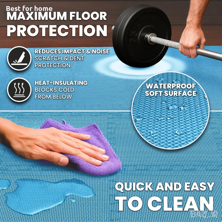 𝗣𝗥𝗔𝗟𝗔𝗧𝗬, 𝗗𝗨𝗥𝗔𝗕𝗟𝗘, 𝗥𝗘𝗟𝗜𝗔𝗕𝗟𝗘 - силно компресираната, екологична, нетоксична EVA пяна с противоплъзгаща повърхност е идеална като подово покритие за фитнес и фитнес зали, под спортно оборудване, работни пространства, гаражи, мазета и други. Висококачественият лек материал на постелката я прави също така шумо- и удароизолираща, топлоизолираща, водоустойчива, дълготрайна и лесна за почистване със сапун и вода.