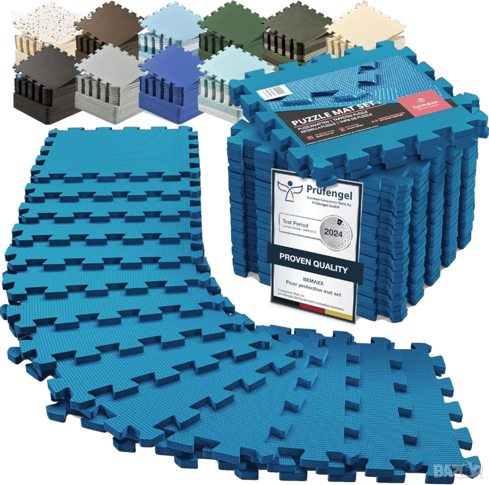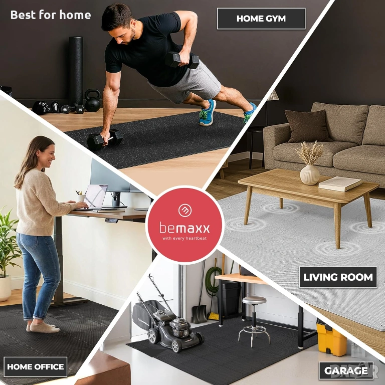 Комплект постелки за фитнес bemaxx - 18 бр. подови плочки от EVA пяна (31,6 x 31,6 x 0,4 инча), 16 кв. м., защитни подови настилки за фитнес зала, спортни постелки за домашна тренировка, постелки за упражнения, пъзели, гараж, фитнес, детска стая, басейн, бягаща пътека, велоергометър.