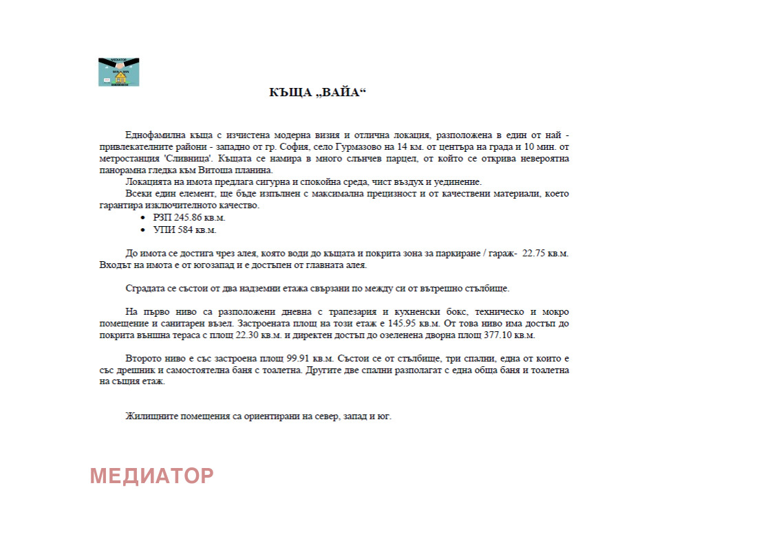 Представяме няколко къщи в с. Гурмазово, на 14км. от центъра на София. Къщите са представени с описание и визуализация в прикачените към офертата файлове. Цената е 1 150 евро/ кв. метър. Kъщите са завършени, но ще се актуват след предварителен договор, заради финансови съображения в полза на двете страни. Търсете Александър - 0888 80 00 34