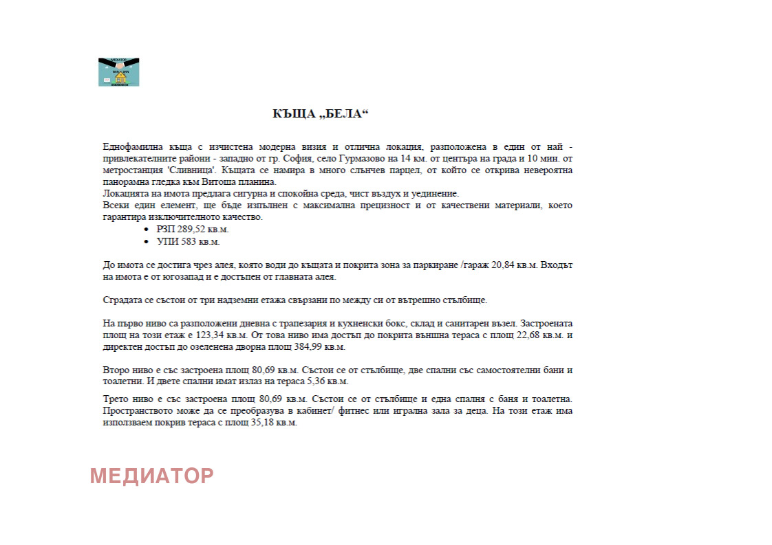 Представяме няколко къщи в с. Гурмазово, на 14км. от центъра на София. Къщите са представени с описание и визуализация в прикачените към офертата файлове. Цената е 1 350 евро/ кв. метър. Kъщите са завършени, но ще се актуват след предварителен договор, заради финансови съображения в полза на двете страни. Търсете Александър - 0888 80 00 34