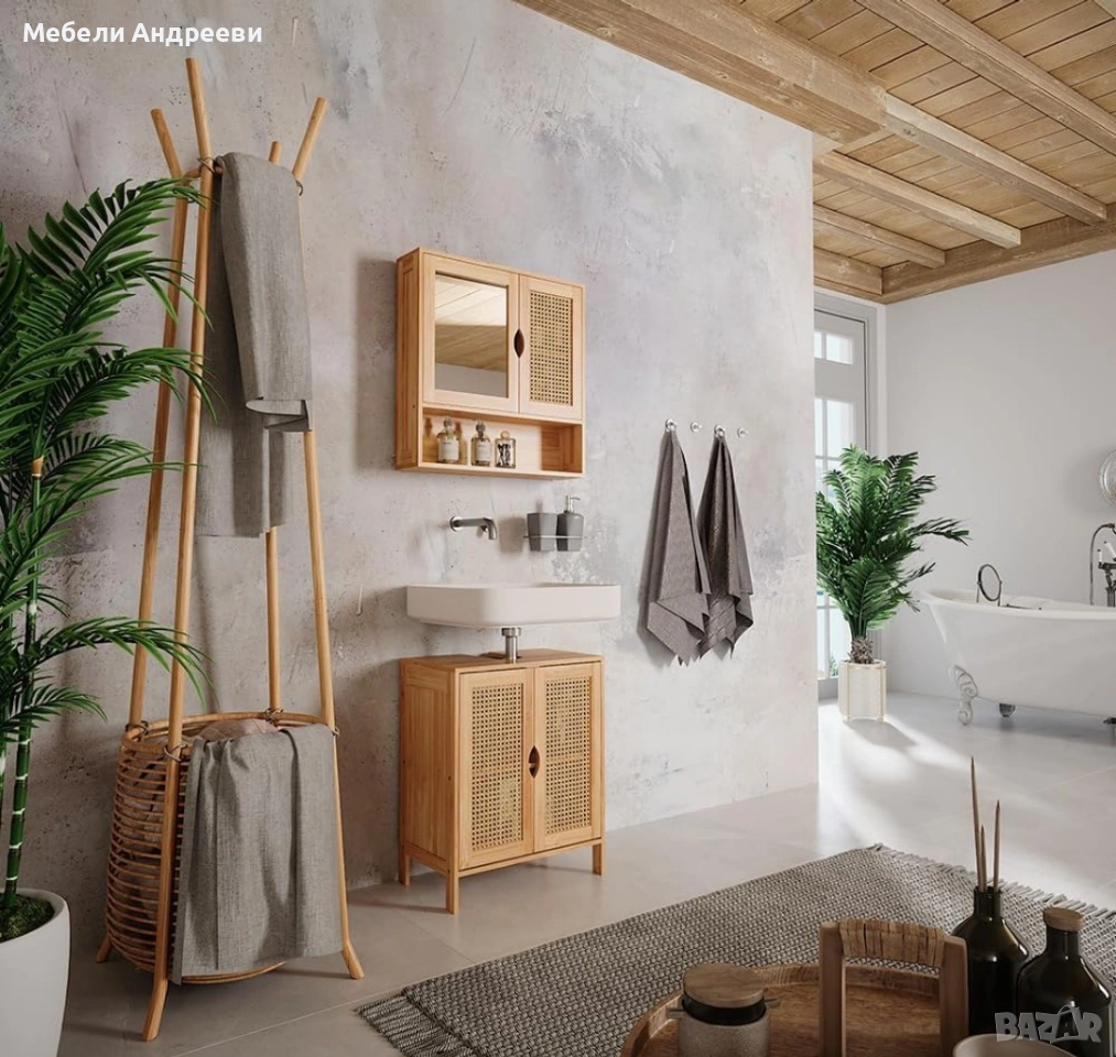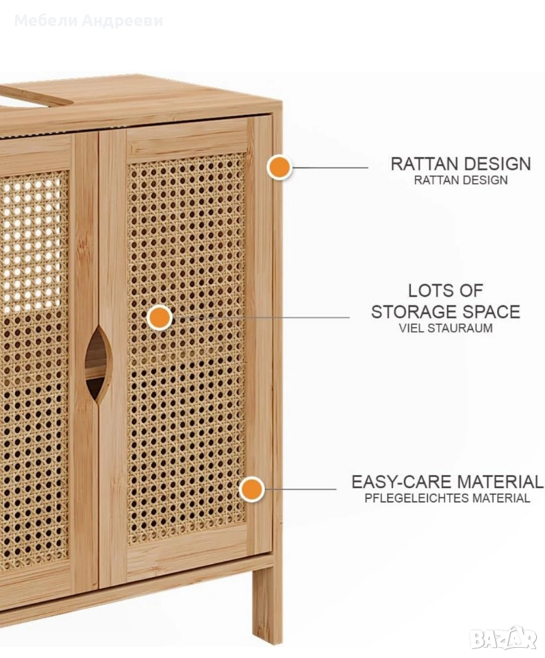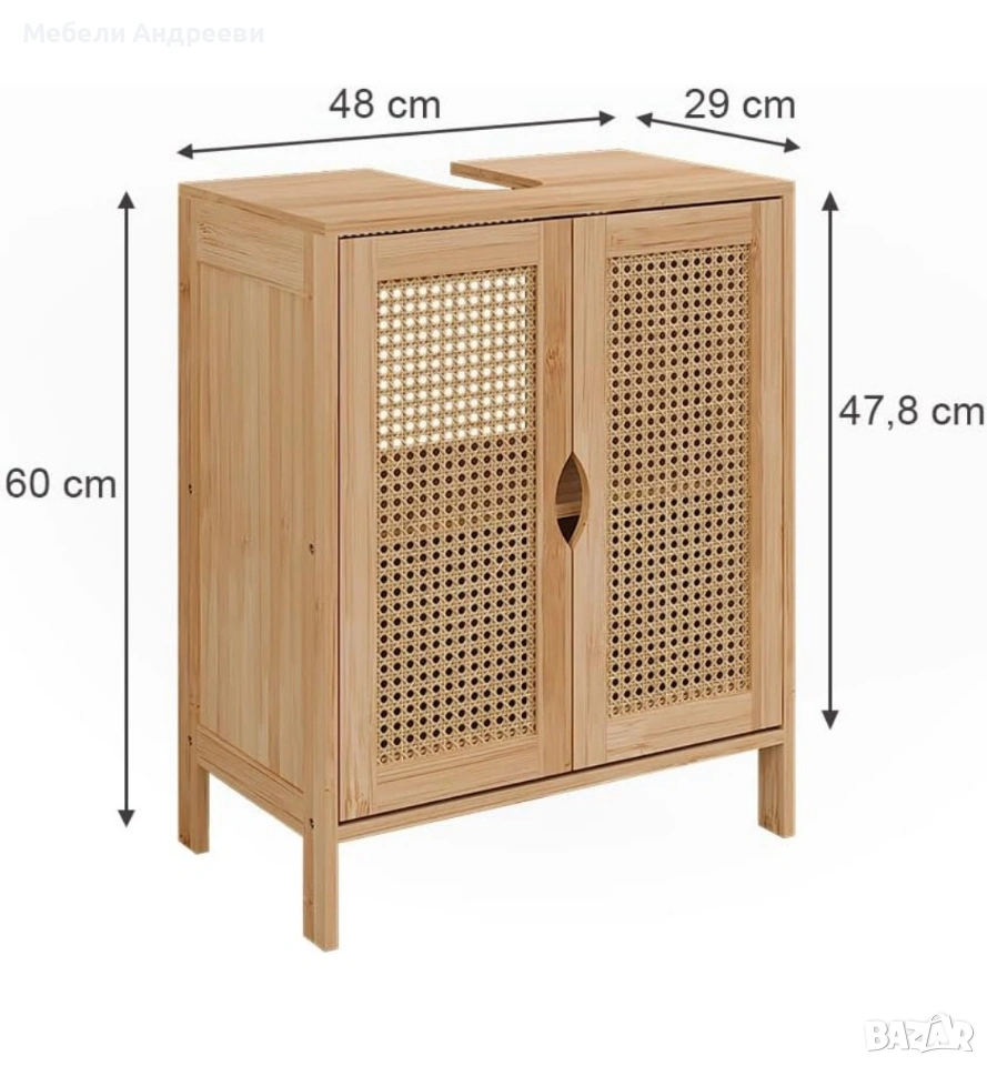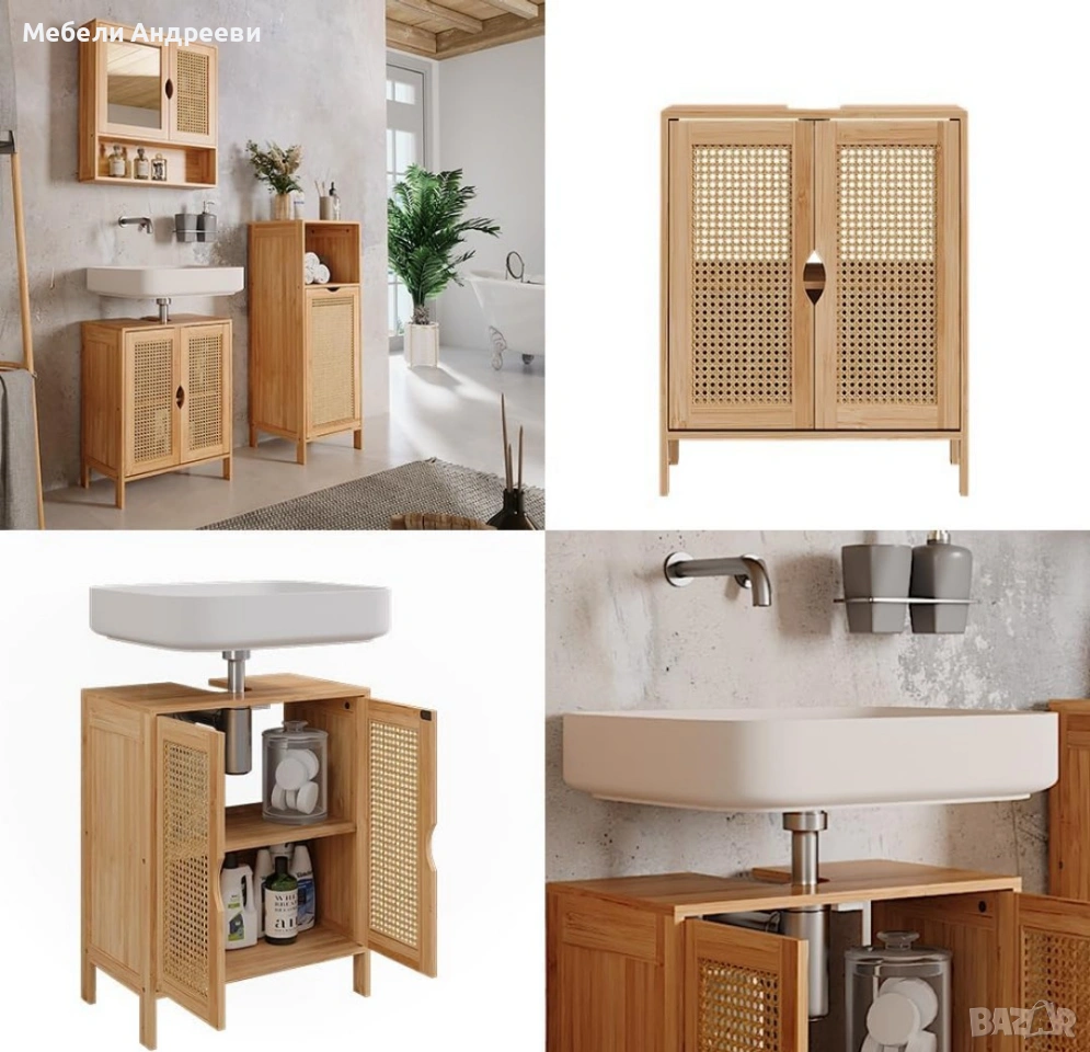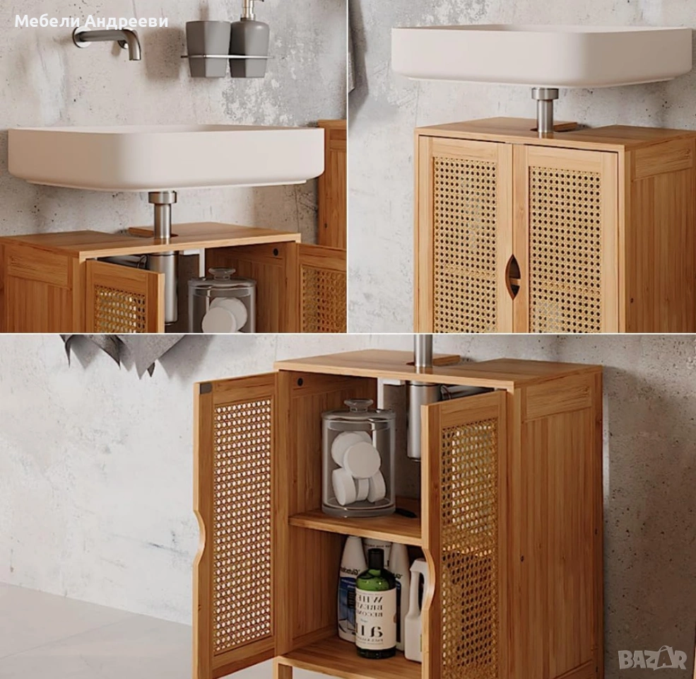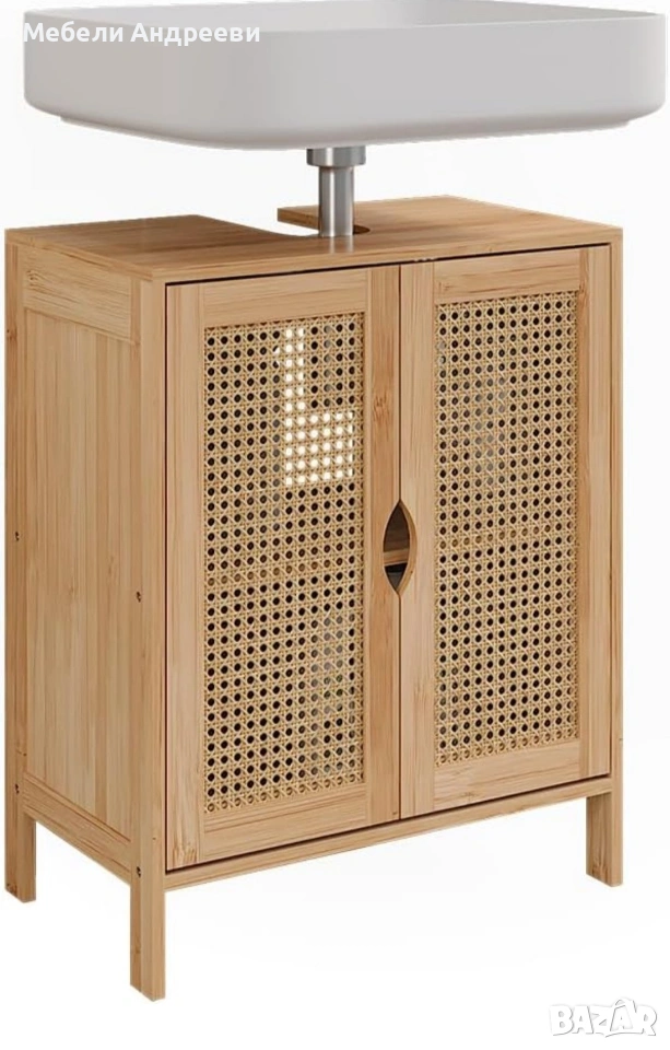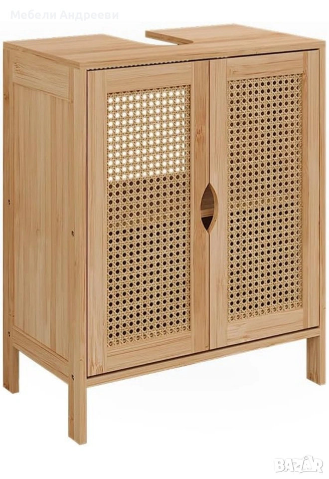 Корпусът е изработен от обработен бамбук – устойчив на влага, стабилен и подходящ за баня. Вратите са с ратанов дизайн за по-естетичен и естествен стил. Вътрешното пространство е функционално подредено и предлага удобно съхранение, като отворът отгоре е предвиден за сифон. Лек, стабилен и стилово универсален модел, който стои отлично в модерни и натурални интериори.