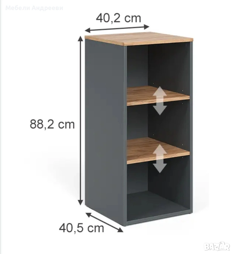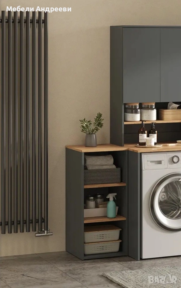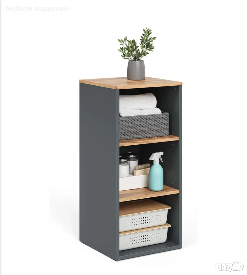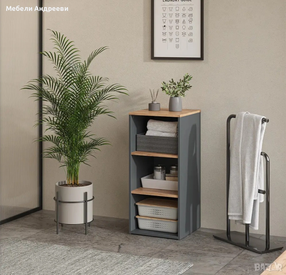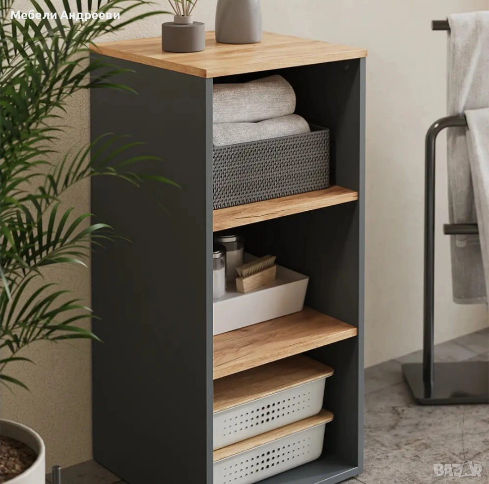 Изработен от ПДЧ с меламиново покритие в цвят графит, комбиниран с рафтове и плот в дъбов декор. Разполага с три нива за подреждане на кърпи, препарати, козметика, кошове или декорации. Подходящ за баня, коридор, перално помещение или като помощен шкаф в дневната.