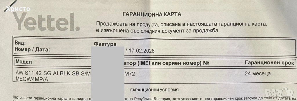 Закупен е на 17.02.2026 г. и има 24 месеца гаранция, която започва от датата на покупката. Моделът е един от най-новите на Apple и предлага модерен LTPO OLED дисплей, GPS, множество спортни режими, мониторинг на сърдечния ритъм, сън, активност и много други функции, подходящ както за ежедневна употреба, така и за спорт. Без бартери!!!