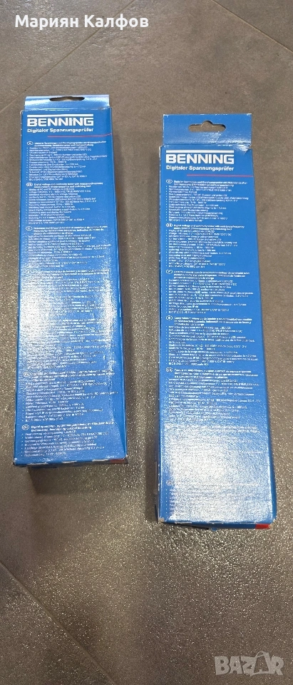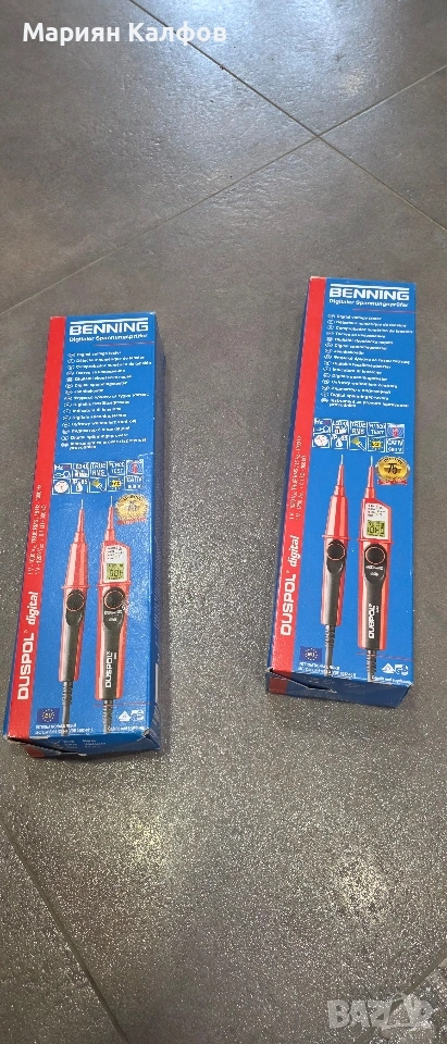 Професионален двуполюсен тестер за напрежение Benning DUSPOL Digital, IP65, LCD, 1-1000 V AC/ 1-1200 V DC с бутони за тест на ДТЗ Тестерите за напрежение от серията DUSPOL на Benning са правилнията избор както за професионални цели, така и за домашни условия. Измервателните уреди на Benning се отличават с качеството и множеството функции, които предлагат. Страна на произход: Германия Технически данни: - индикация LCD дисплей с фоново осветление / LED - oбхват на напрежението 1-1000 V/AC (TRUE RMS)1-1200 V/DC - тест за верига-зумер + жълт LED - тест за фазова последователност - индикация на поляритет: LCD Символ +/– - безконтактно локализиране на прекъсвания на кабели - измерване на съпротивлението 0.1 kΩ-300 kΩ - вибрация - осветление на дисплея - тест на диоди-0,3 V - 2,0 V, ток на изпитване: макс. 10 A - измерване на честота -1 Hz – 1000 Hz - безконтактно тестване на фазите - клас на защита - IP 65 (DIN VDE 0470-1 IEC/ EN 60529) - батерия - 2 x Micro, LR03/AAA (3 V) - тегло - 250 g - температурен обхват на работа и съхранение-20 °C до + 45 °C (климатична категория N) - относителна влажност на въздуха: 20 % до 96 % (климатична категория N) - VDE одобрен, CAT IV 600 V, CAT III 1000 V Разполагам с 4 броя. Цена за 1 брой 105 евро За повече от 1 брой ще договорим по-ниска цена.