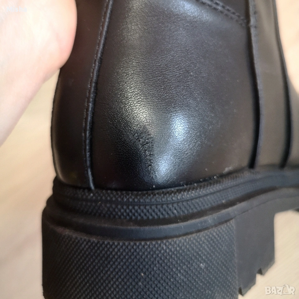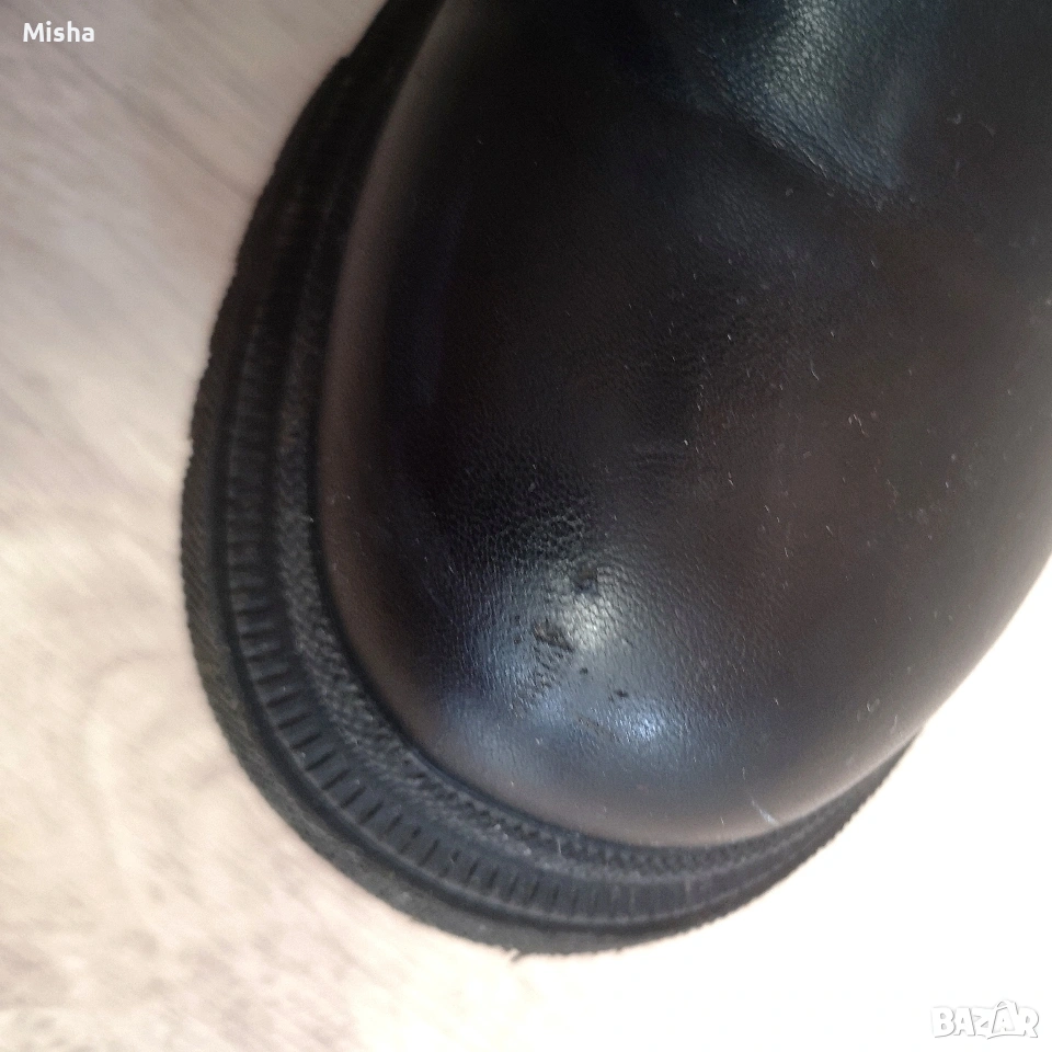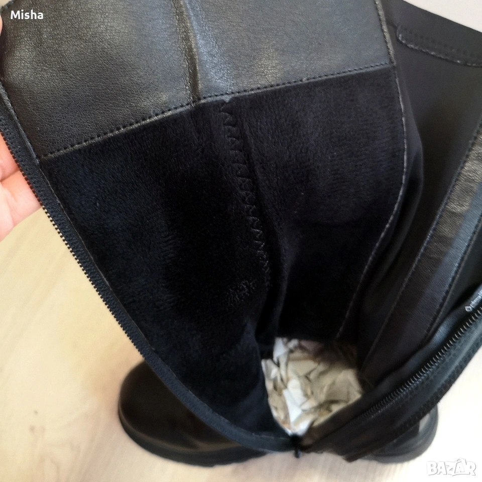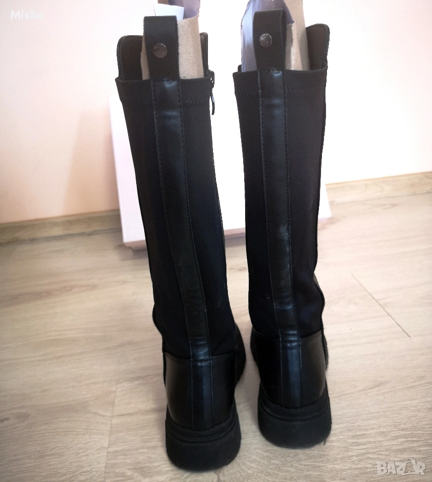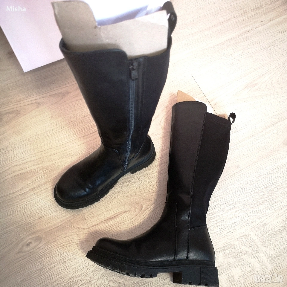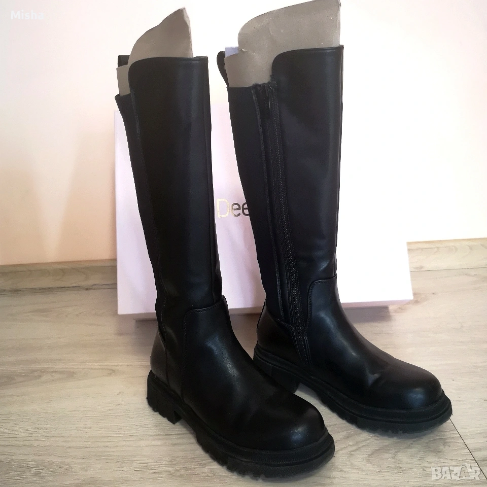 Детски високи до коляното ботуши от еко кожа и неопрен на марката DEE ZEE, 34 номер. Отвътре са с мека подплата. Имат цип от вътрешната страна. Слагани са броени пъти. Имат много леки забележки - на дясната пета и на лявата обувка отпред, но иначе са абсолютно здрави. Подметките са като нови. Дължина на стелката 21см.