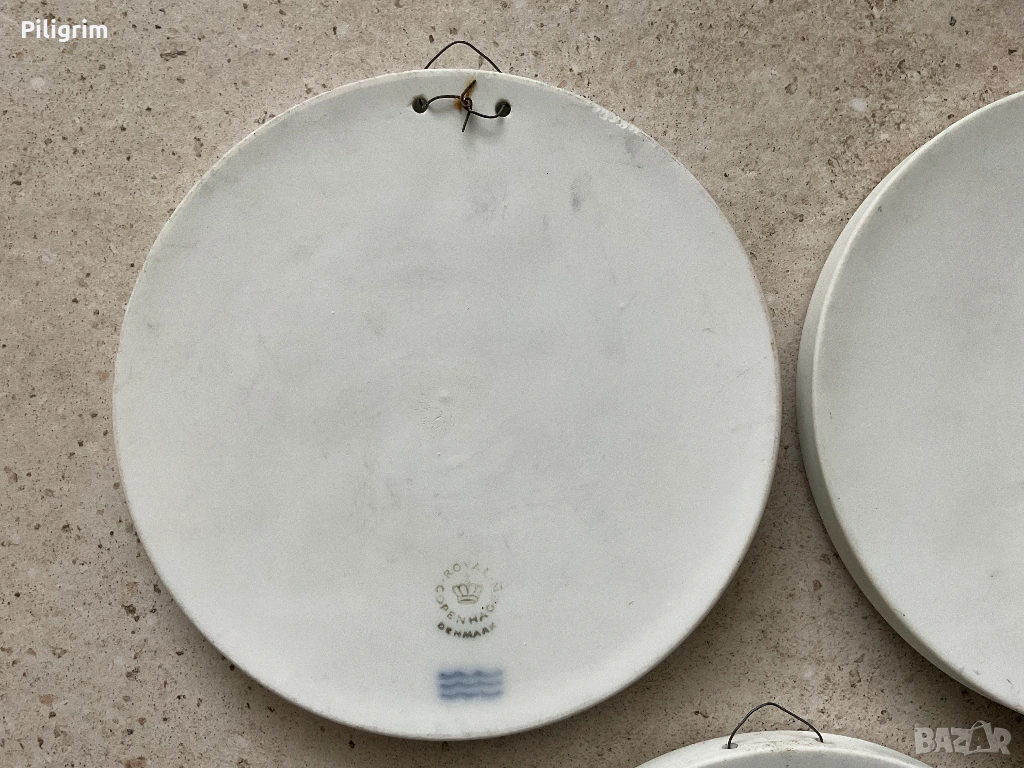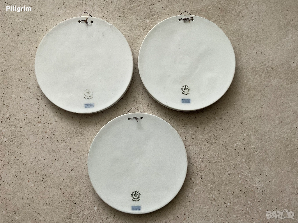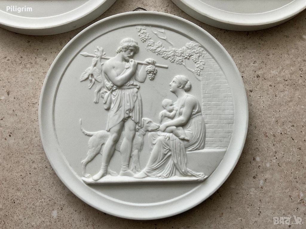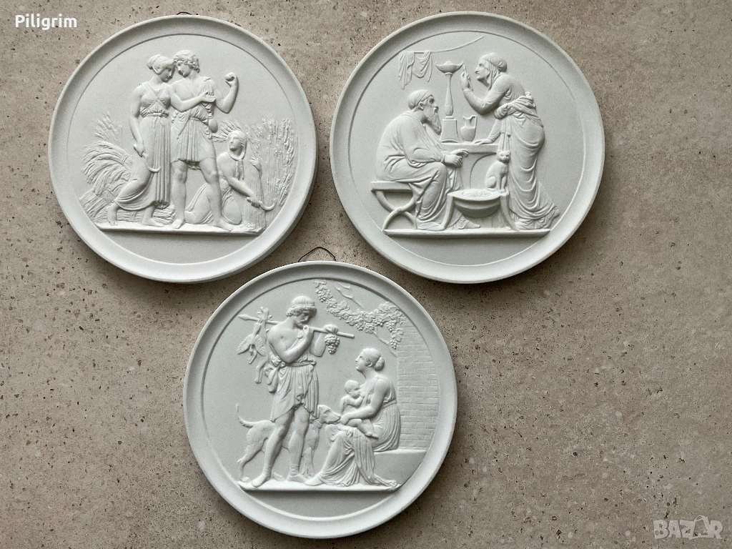 Стенен релеф „Сезони“. Кръгли панели с класически сцени, вдъхновени от произведенията на скулптора Бертел Торвалдсен. Диаметър: 14 см. Комплект от три стенни релефа „Сезони“ от Royal Copenhagen. Всеки от тях изобразява класическа сцена.