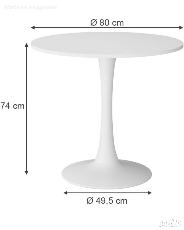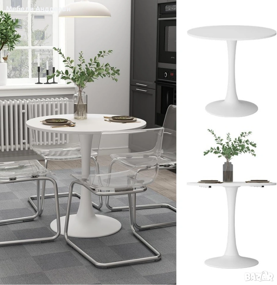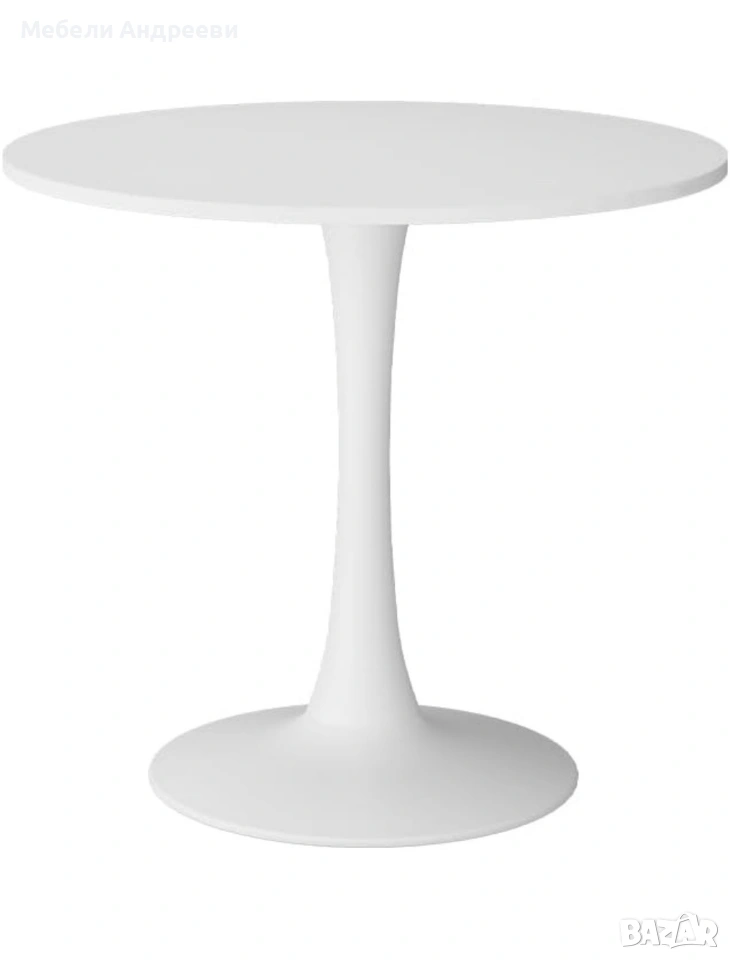 Кръглата маса е в модерен Tulip стил – изчистен плот, елегантна централизирана основа и отлично съотношение между стабилност и визия. Плотът е изработен от устойчиво ПДЧ с лесно за поддръжка покритие. Основата е стабилна и осигурява комфорт при сядане без пречки от крака. Подходяща за кухня, трапезария или малки пространства.