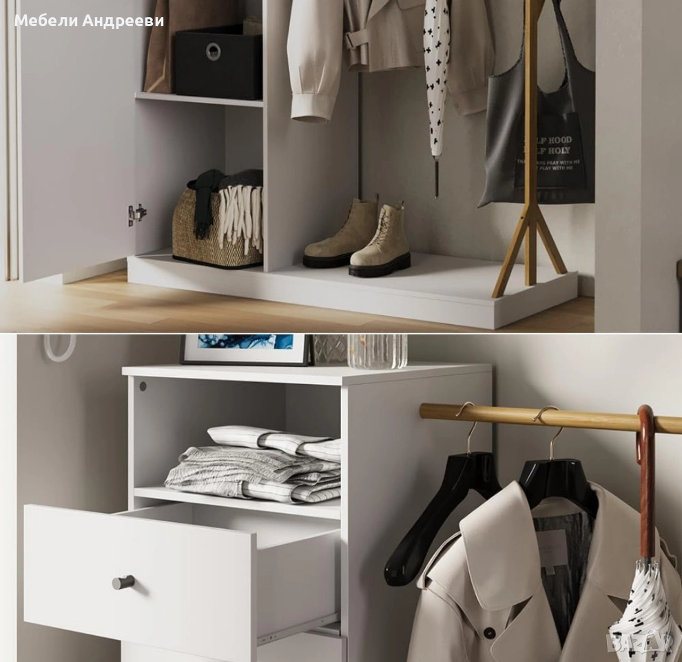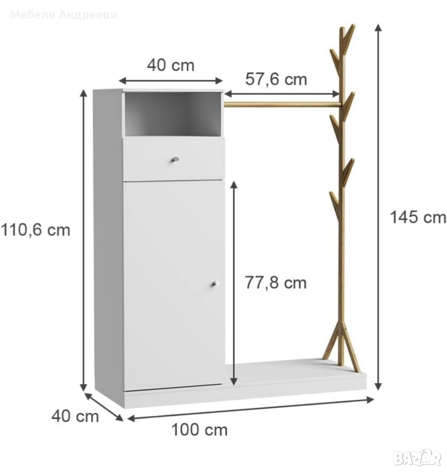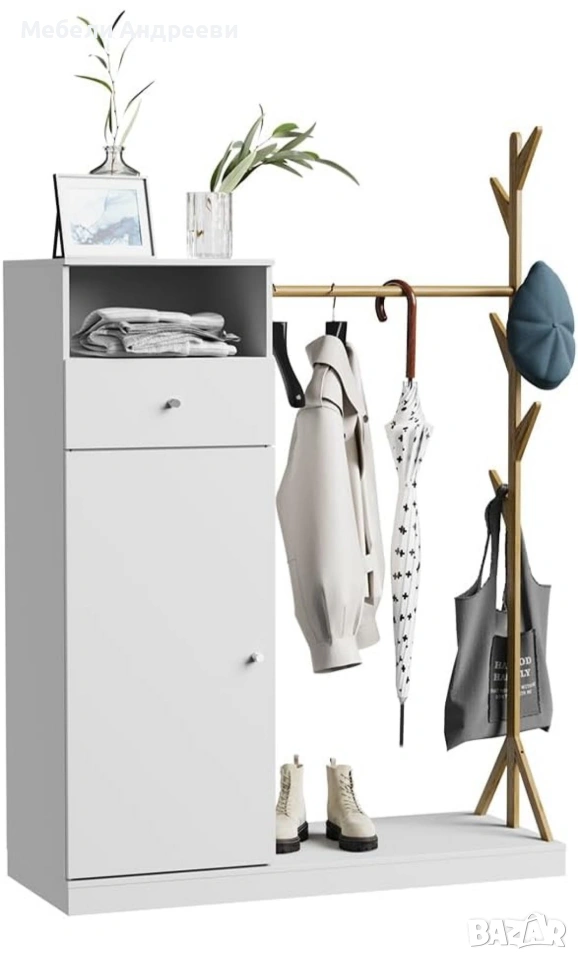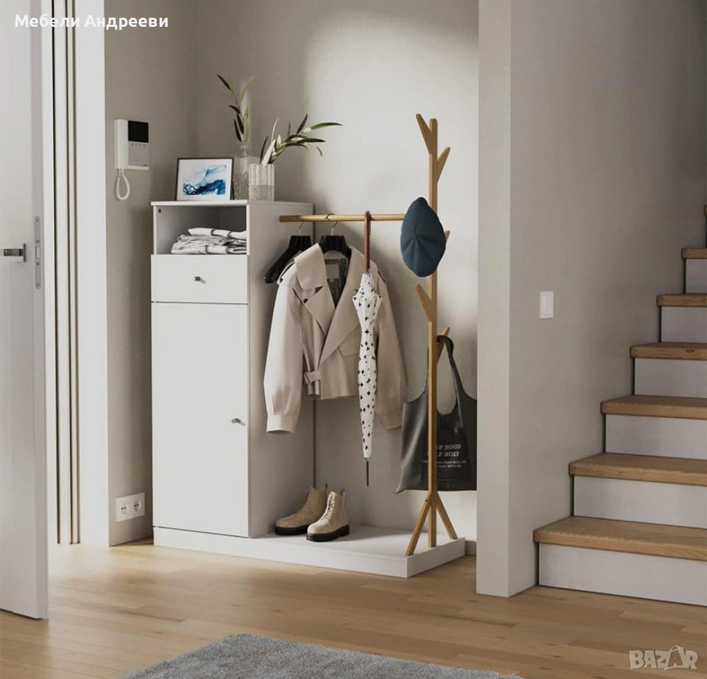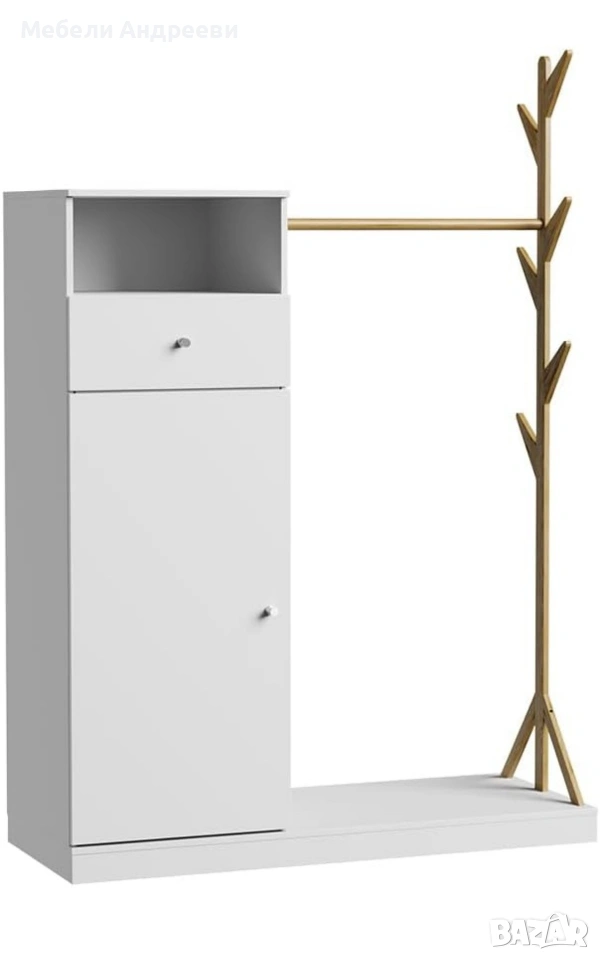 Портмантото съчетава шкаф с врата, чекмедже и открит рафт, плюс стоящ държач за дрехи и лост от истински бамбук. Основната конструкция е изработена от висококачествено ПДЧ, стабилна и лесна за поддръжка. Бамбуковата стойка придава естествен акцент и е идеална за якета, палта и аксесоари. Долната платформа е удобна за обувки и чанти, без да заема много място в коридора.