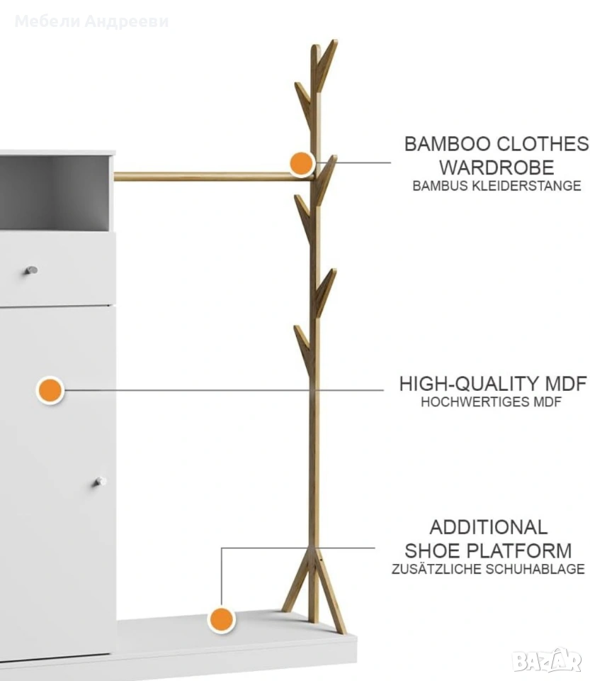 Ключови думи: портманто, шкаф за обувки, закачалка за дрехи, бамбук, шкаф за коридор, мебел за антре, hallway furniture, немски мебели, нови мебели, внос Германия, сканди стил, ПДЧ