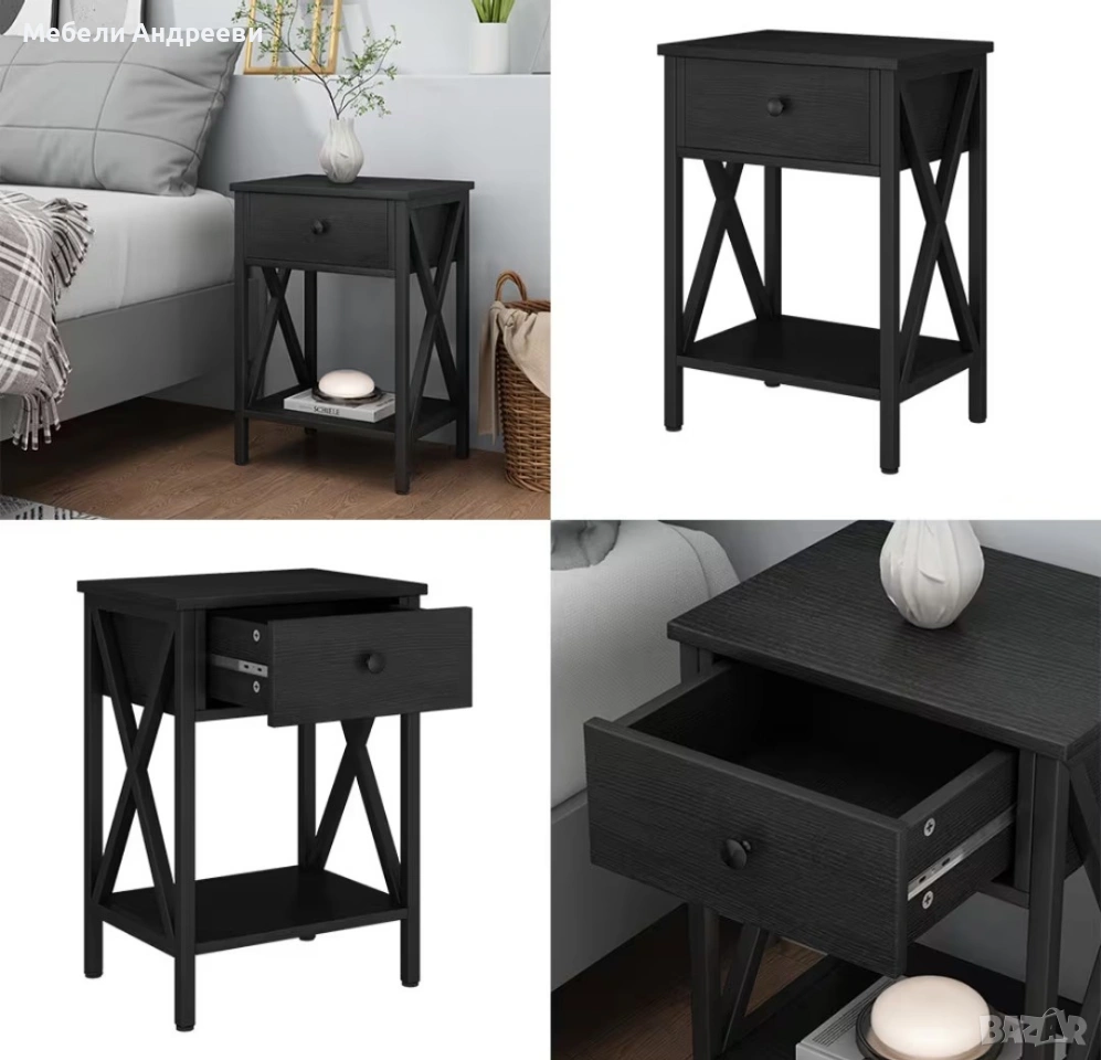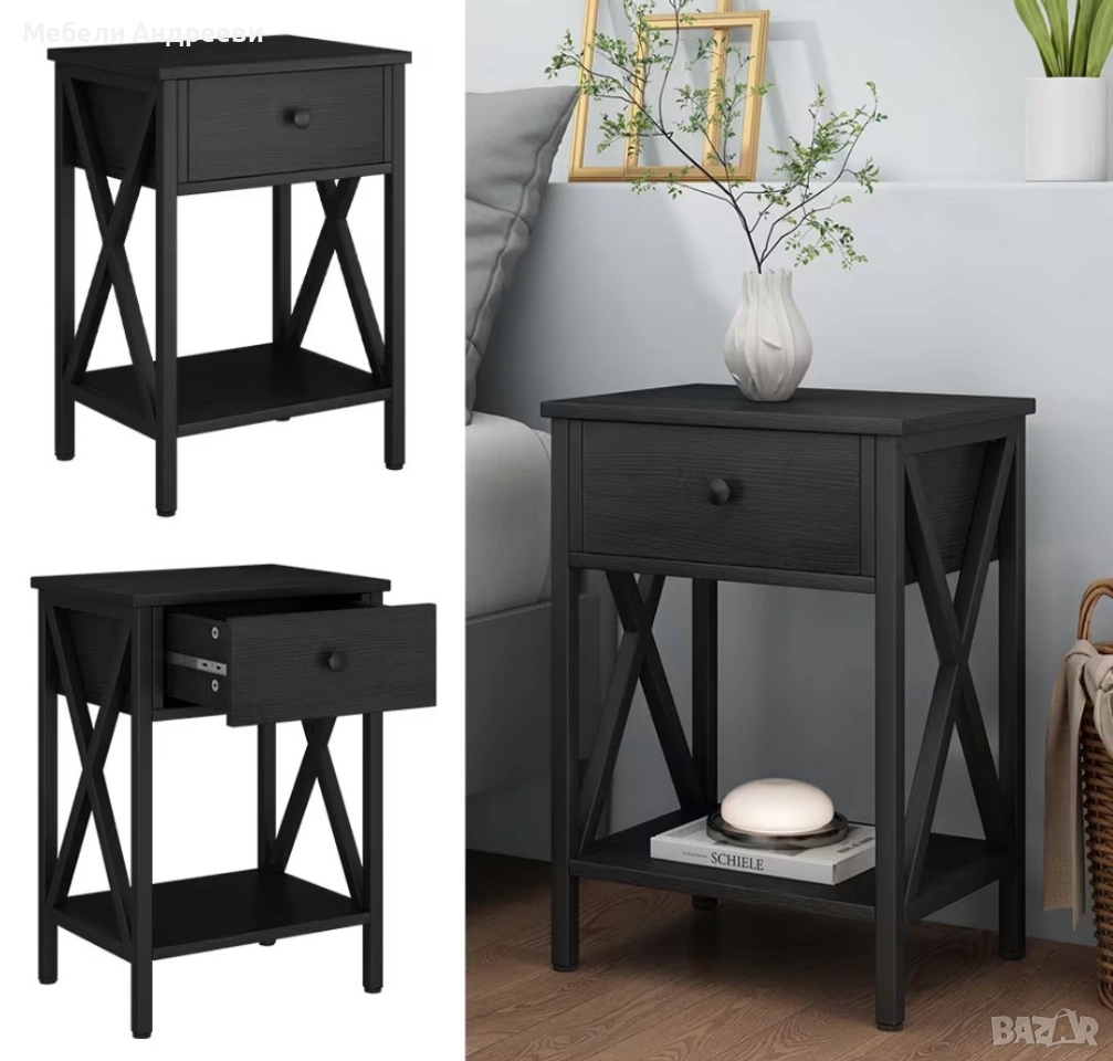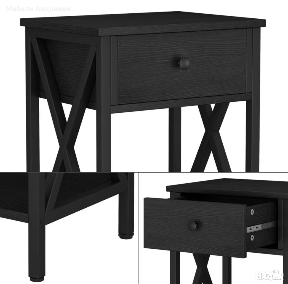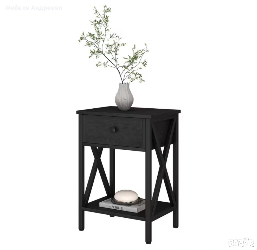 Шкафчето е стабилно, практично и с модерен черен дизайн. Разполага с удобно чекмедже за дребни вещи и долен отворен рафт за книги, декорации или техника. Страничните „X“ елементи дават стил и здравина. Подходящо за спалня, хол или кабинет.