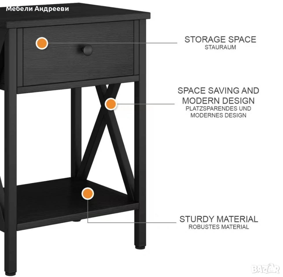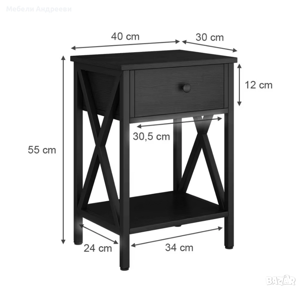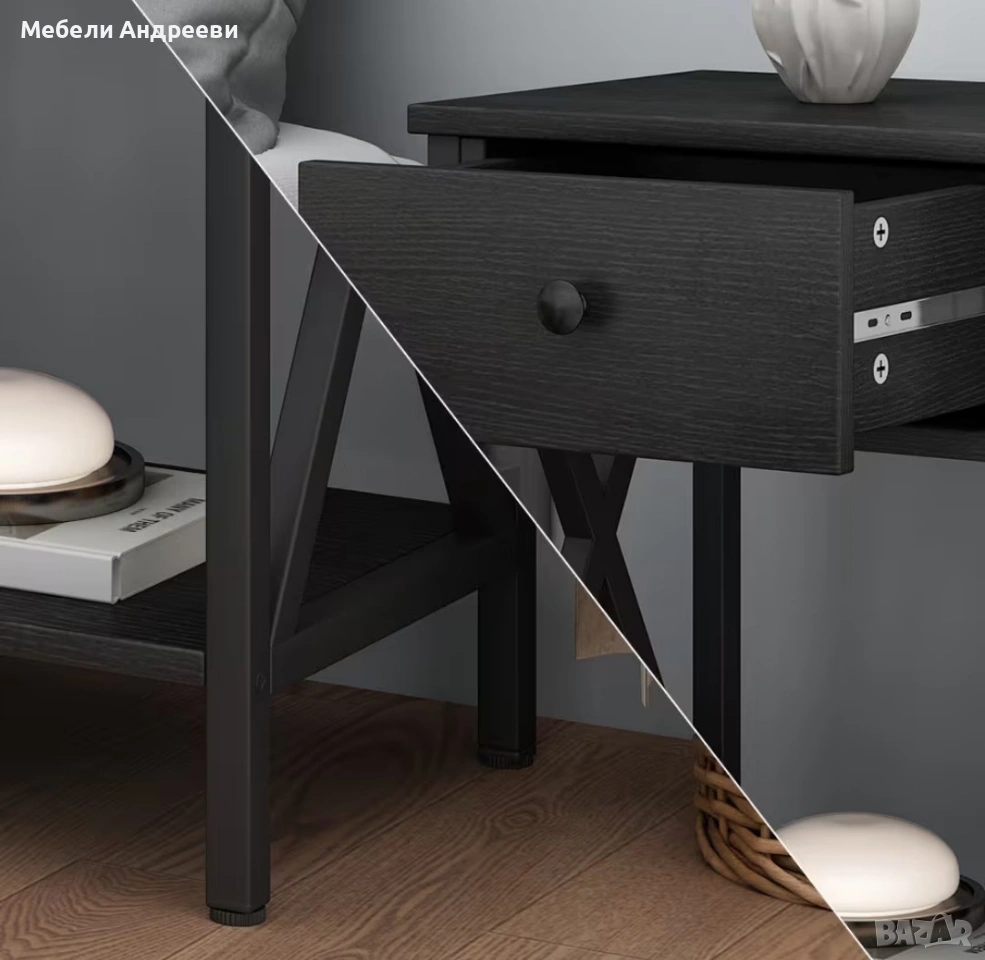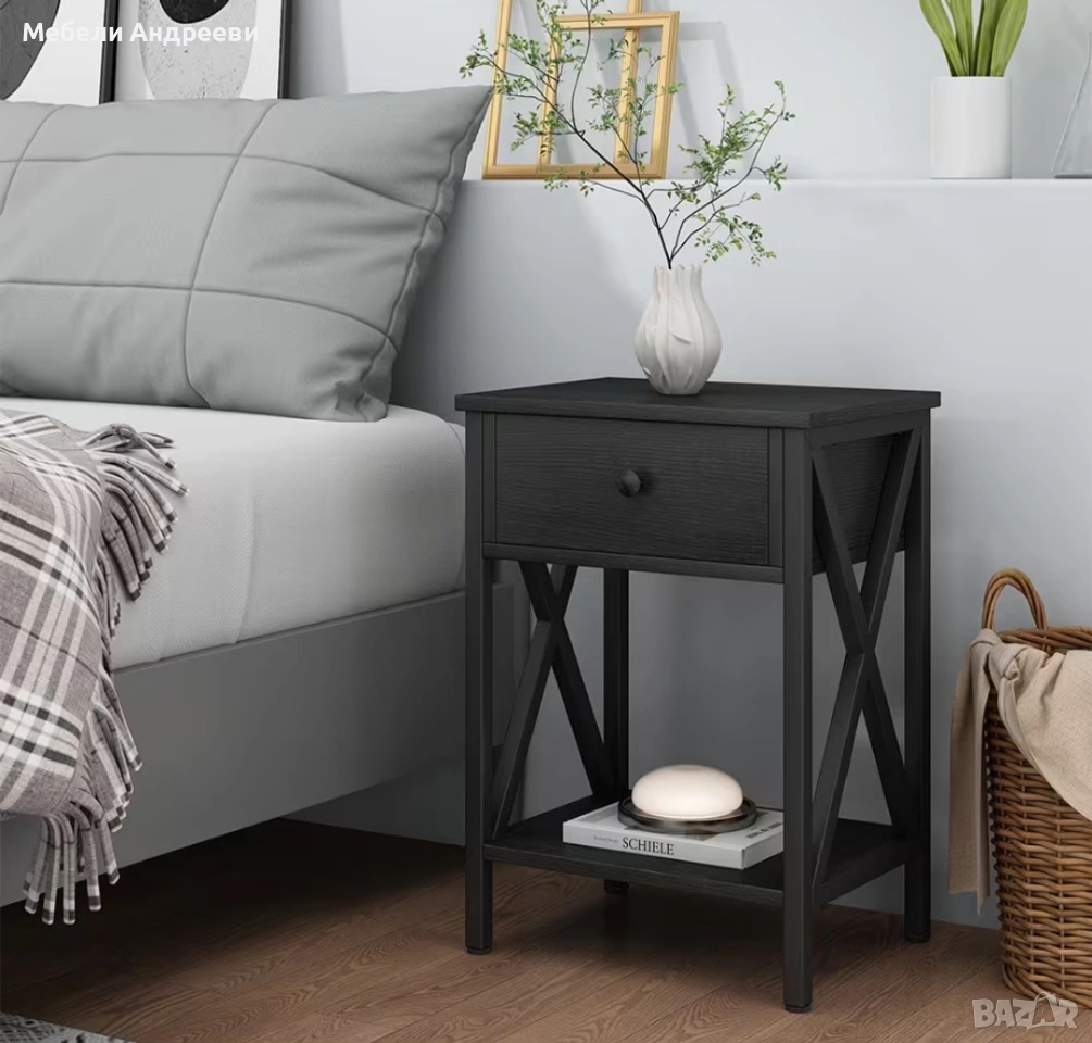 Шкафчето е стабилно, практично и с модерен черен дизайн. Разполага с удобно чекмедже за дребни вещи и долен отворен рафт за книги, декорации или техника. Страничните „X“ елементи дават стил и здравина. Подходящо за спалня, хол или кабинет.