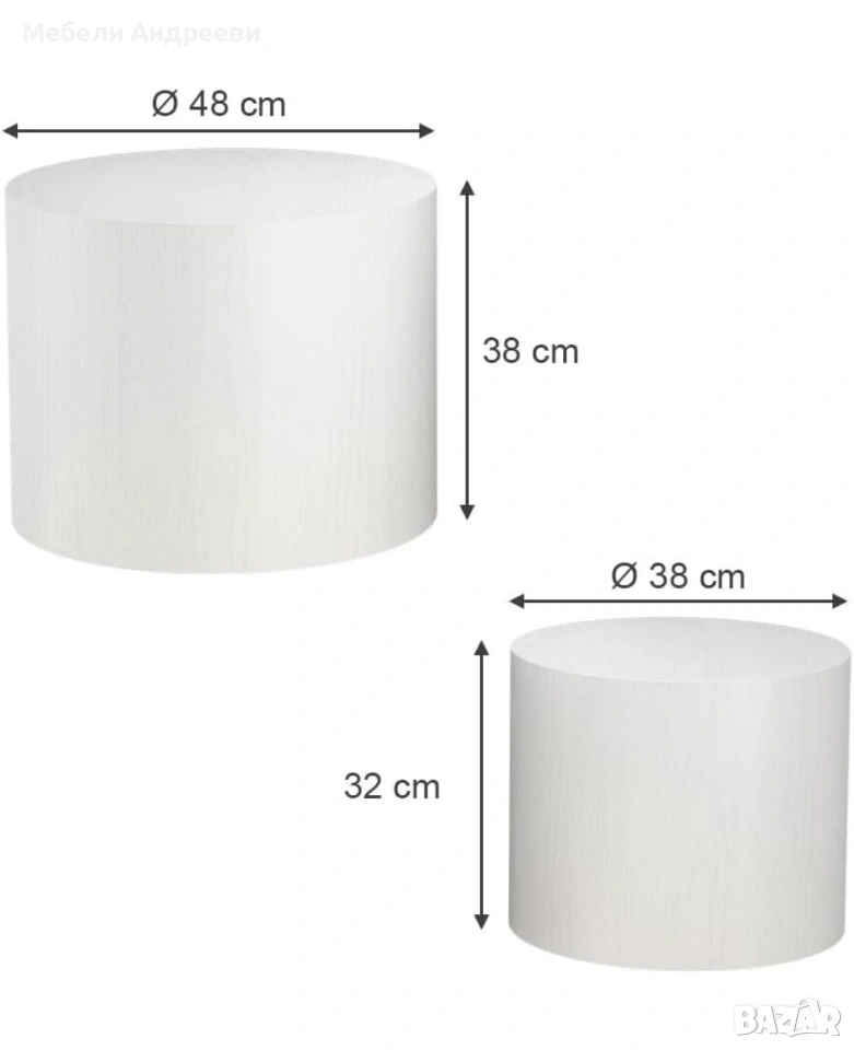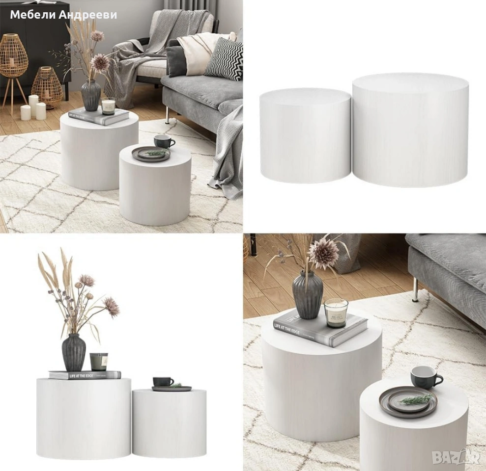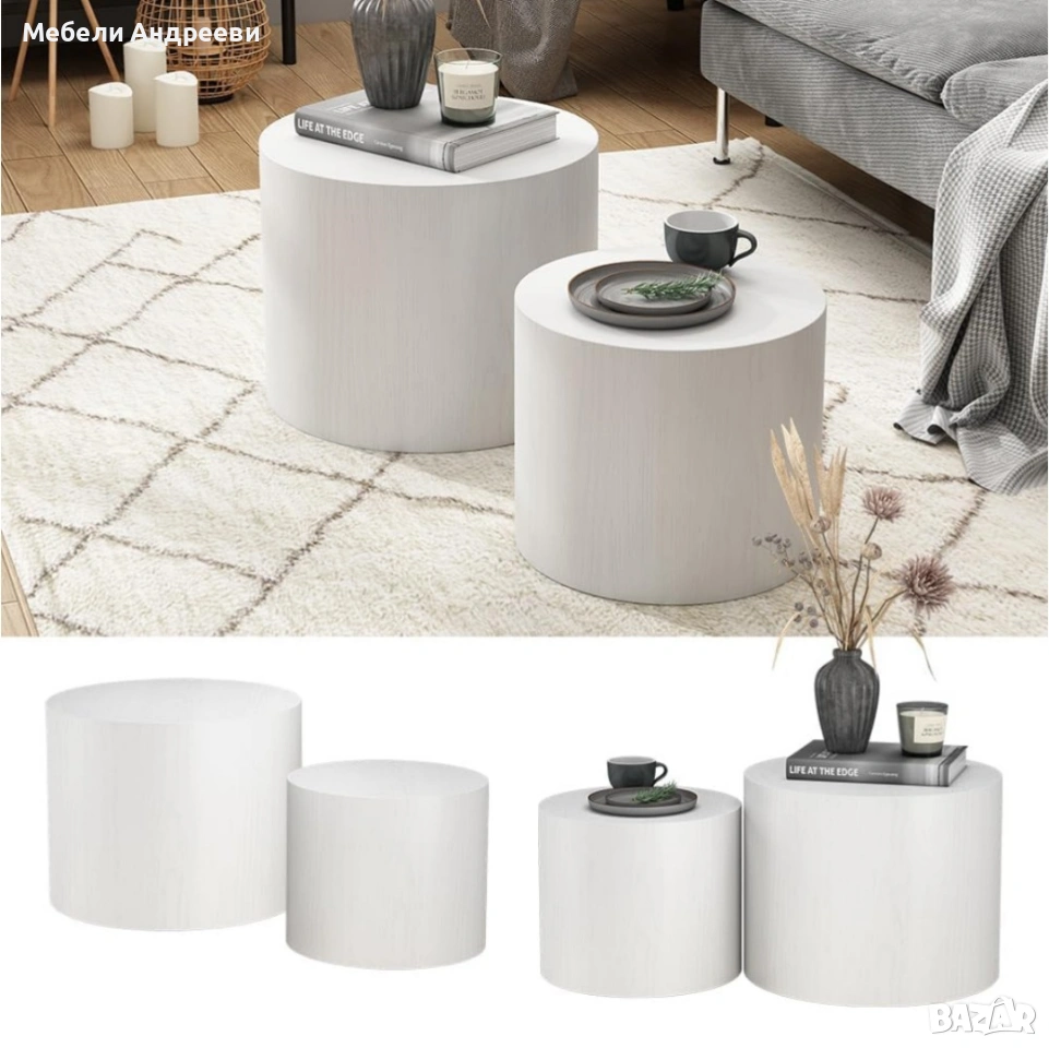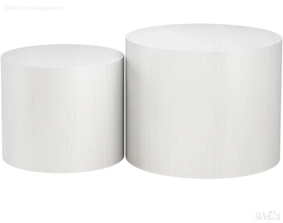 Комплектът включва две модерни цилиндрични маси, изработени от висококачествен MDF материал с гладко и устойчиво покритие. Елегантната форма ги прави подходящи за хол, спалня, офис или като декоративни помощни масички. Масите са леки, стабилни и лесни за поддръжка. Универсален дизайн, който стои добре във всеки интериор.