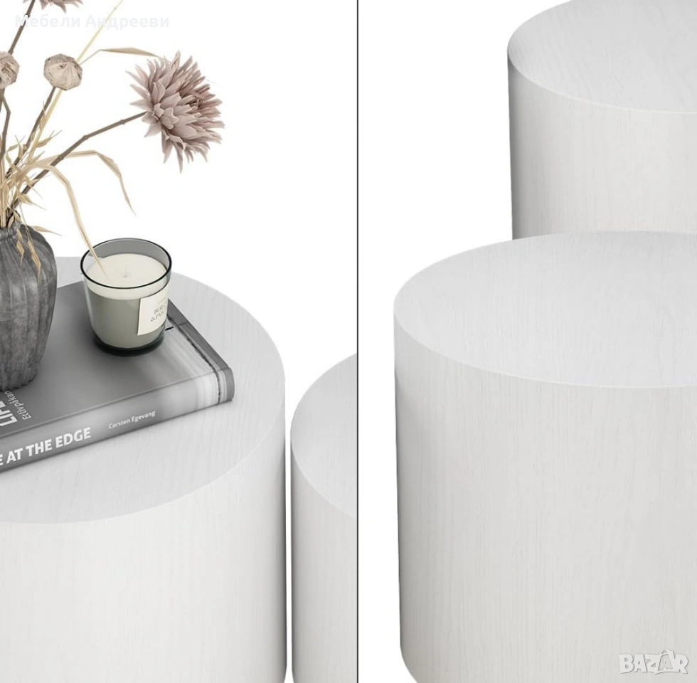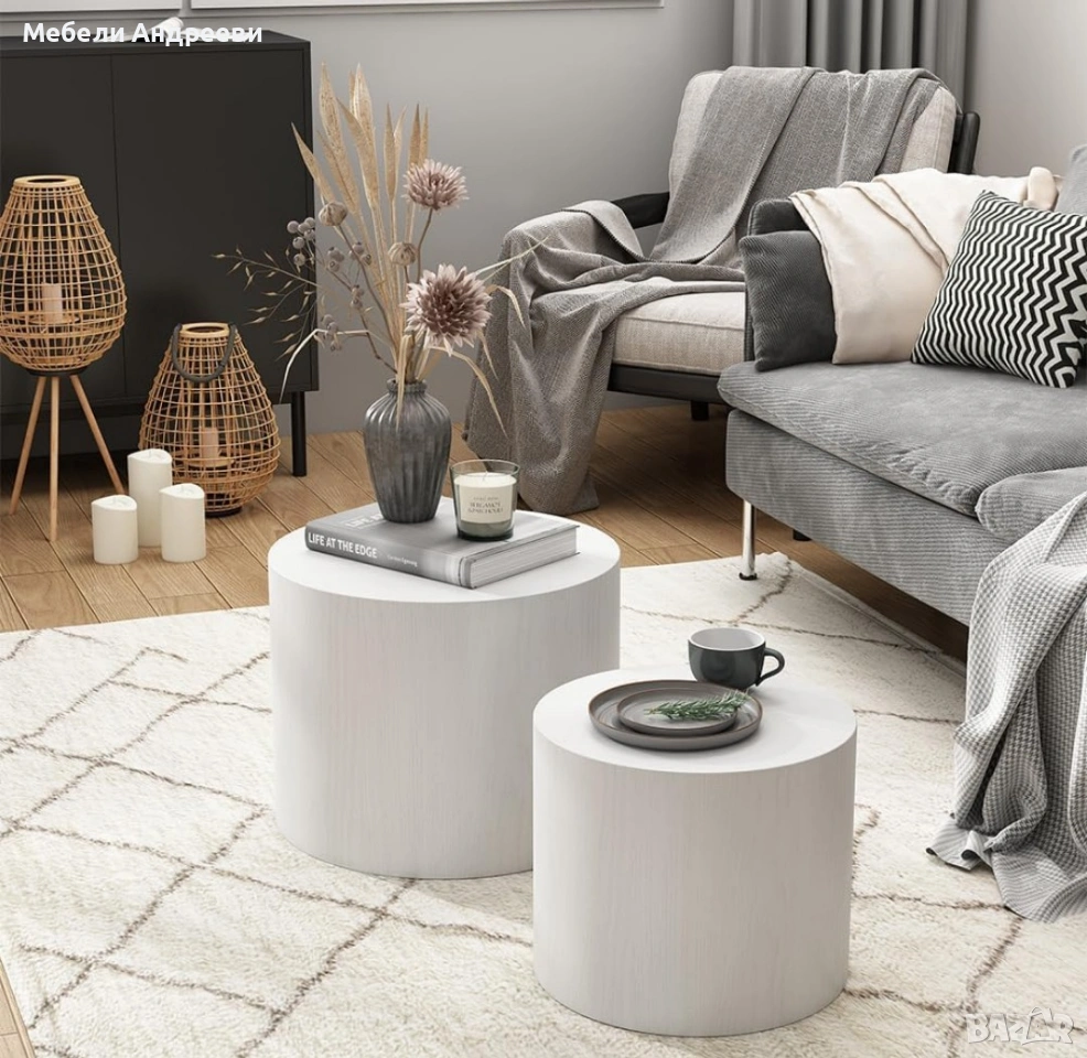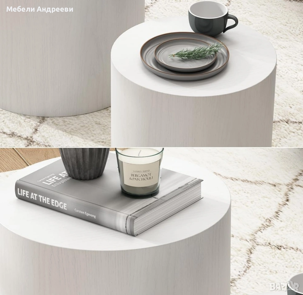 Комплектът включва две модерни цилиндрични маси, изработени от висококачествен MDF материал с гладко и устойчиво покритие. Елегантната форма ги прави подходящи за хол, спалня, офис или като декоративни помощни масички. Масите са леки, стабилни и лесни за поддръжка. Универсален дизайн, който стои добре във всеки интериор.