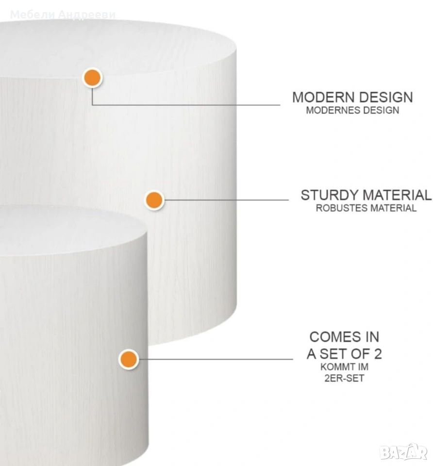 Ключови думи: холни маси, цилиндрични маси, маси Vicco, MDF маси, модерни масички, комплект маси, помощна маса, масичка за кафе, нови мебели, немски мебели, внос Германия.