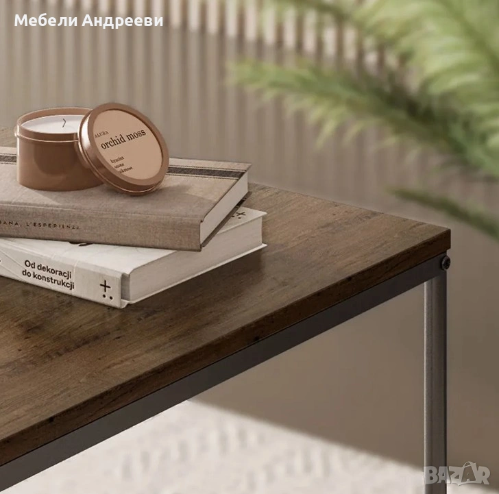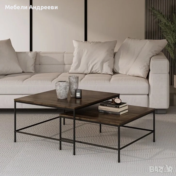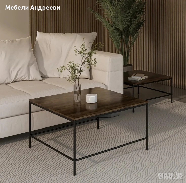 Комплектът включва две маси с индустриален дизайн – стабилна черна метална конструкция и MDF плот с дървесна текстура. Масите могат да се използват заедно или поотделно, като основна холна маса или помощни масички. Леки, удобни и устойчиви на ежедневна употреба. Перфектно допълнение към модерни и минималистични интериори.