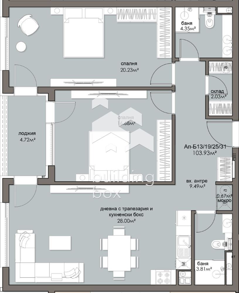БИЛДИНГ БОКС представя сграда, която се отличава с просторни жилища с перфектно разпределение, нисък процент общи части и високо качество на строителството, изпълнено от опитни професионалисти, които осигуряват сигурност и комфорт за бъдещите обитатели.