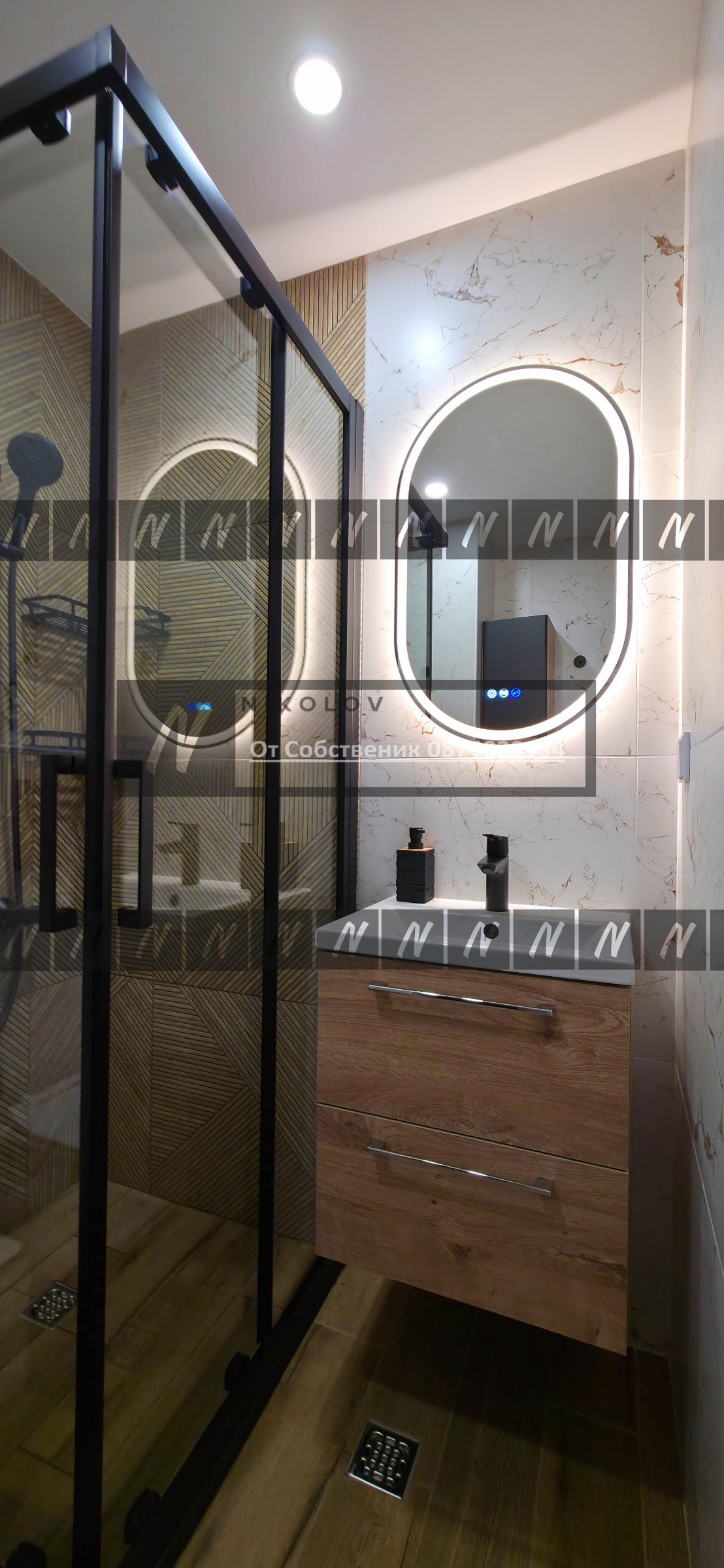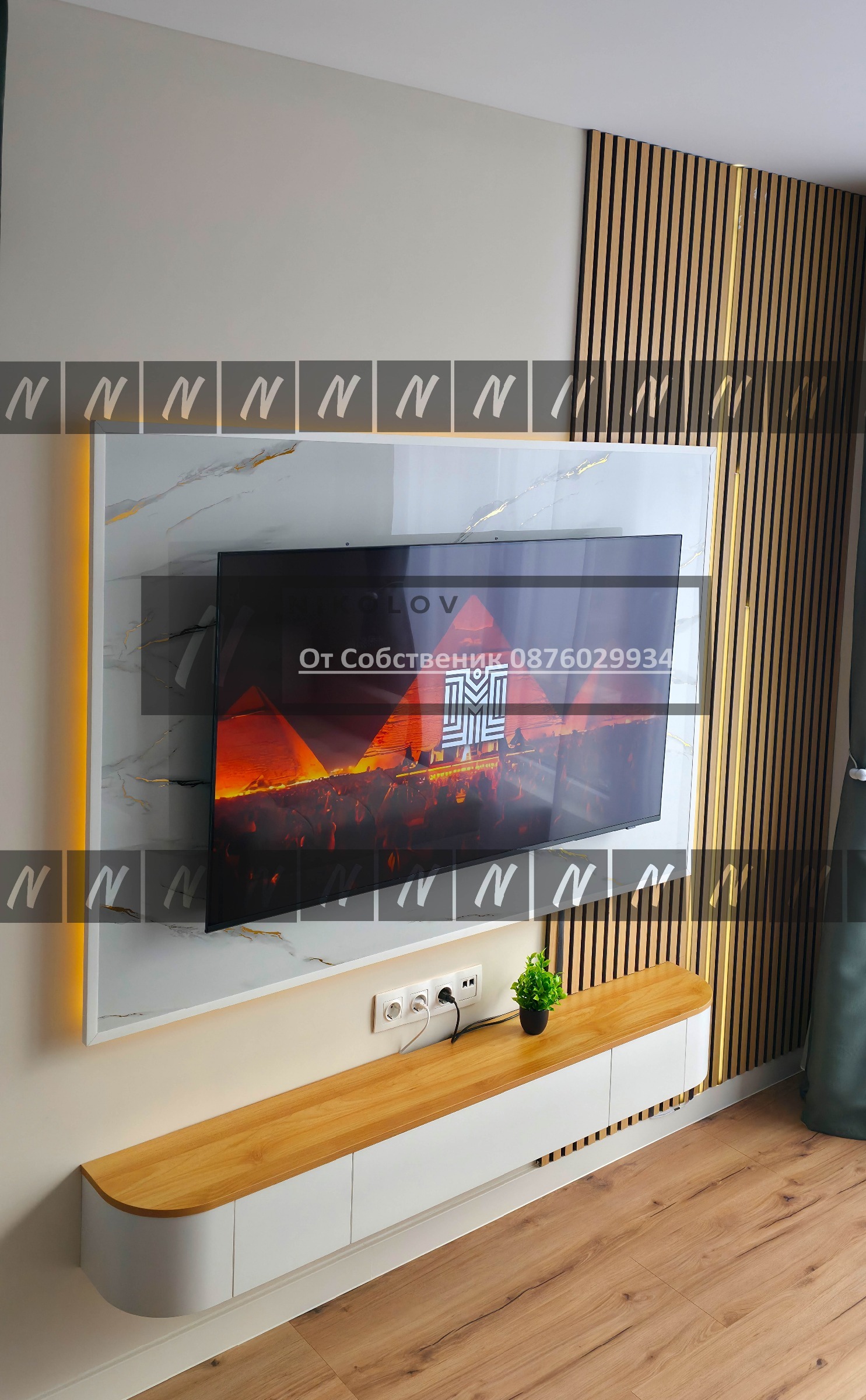 Мултимедия: Два смарт телевизора Samsung 2025 (55' в хола и 50' в спалнята). Холът разполага с ефектна мултимедийна стена с LED осветление.