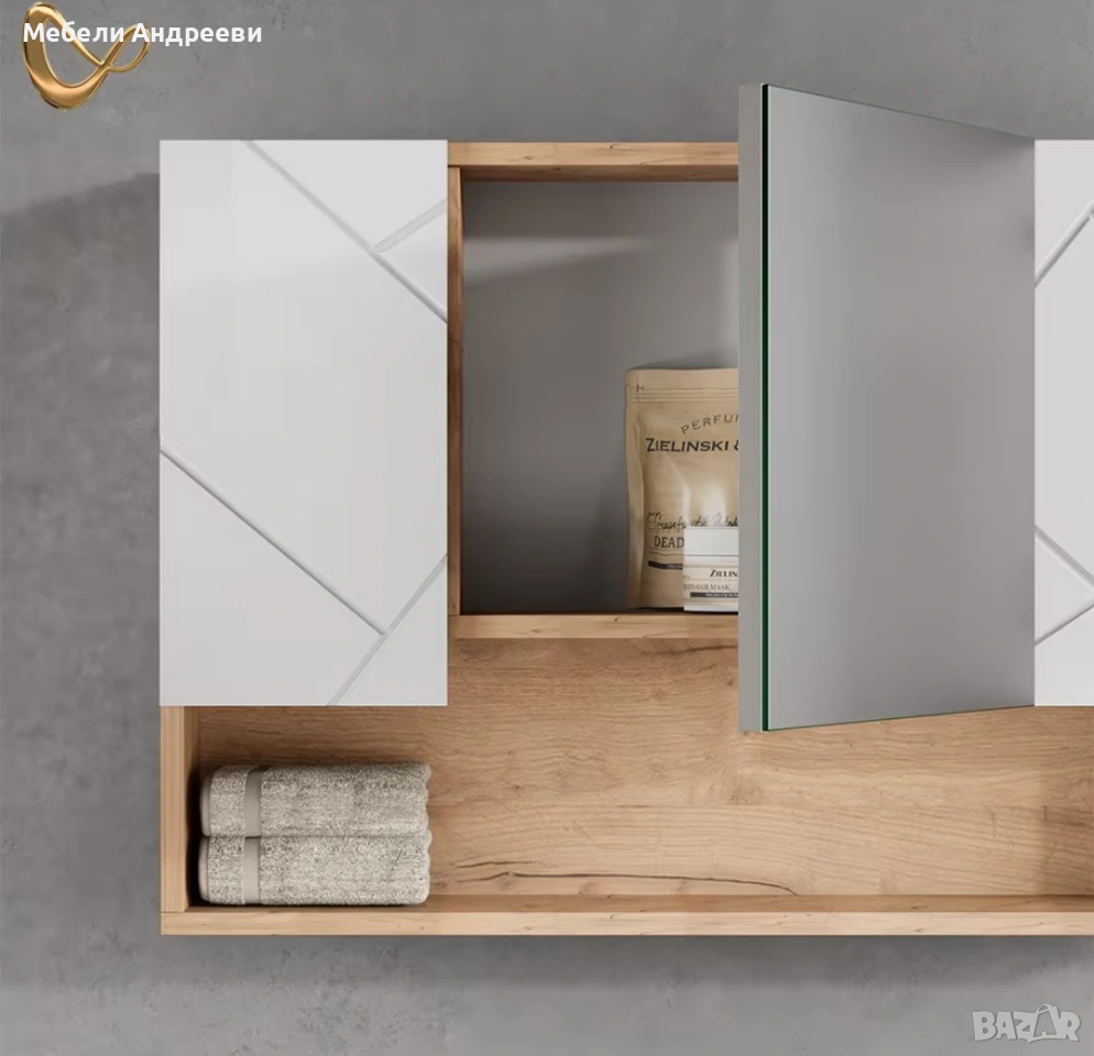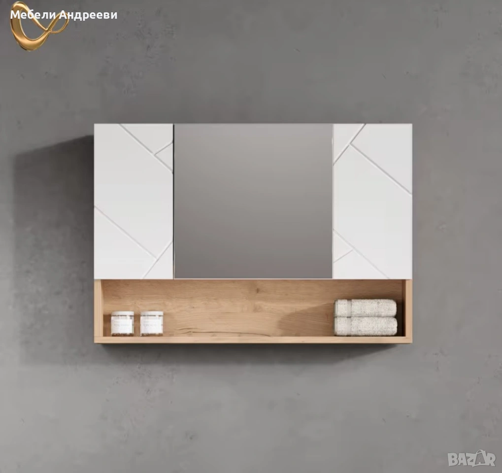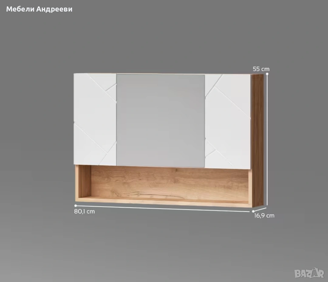 Шкафът има централно огледало, две бели врати с декоративни линии и отворен долен рафт за козметика, кърпи или ежедневни вещи. Модерен, чист дизайн и надеждна конструкция от ПДЧ с меламиново покритие – лесно за поддръжка и устойчиво на влага. Идеален за всяка баня.