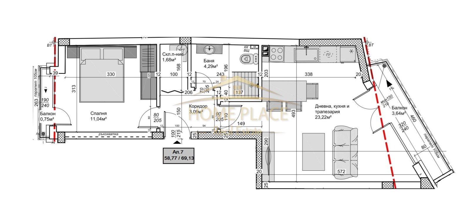 Агенция 'Home Place' продава двустаен апартамент, разположен на четвърти етаж в новострояща се жилищна сграда. Състои се от коридор, комбиниран санитарен възел, килер, спалня, дневна-трапезария и два балкона. Сградата е малка, находяща се в непосредствена близост до бул.Васил Левски. Предлагат се външни и подземни паркоместа. Срок за въвеждане в експлоатация м.08/2025г. Все още има налични и други двустайни апартаменти.