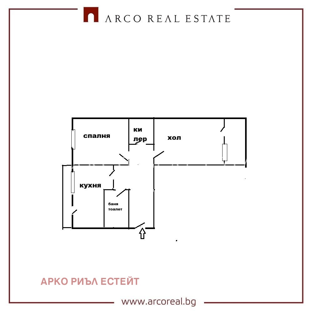 Разпределение: Входно антре, хол с тераса, спалня, кухня с тераса, баня с тоалетна, килер.