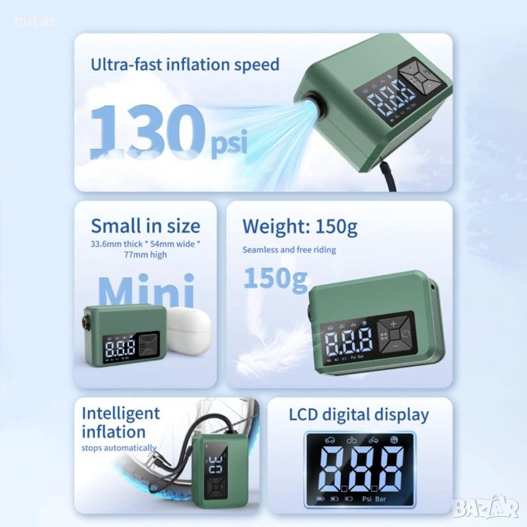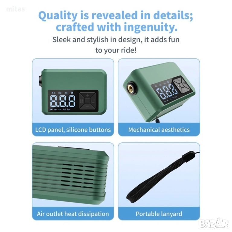 - Мултифункционалност: Освен като помпа, устройството служи като прецизен дигитален манометър за проверка на текущото състояние на гумите.