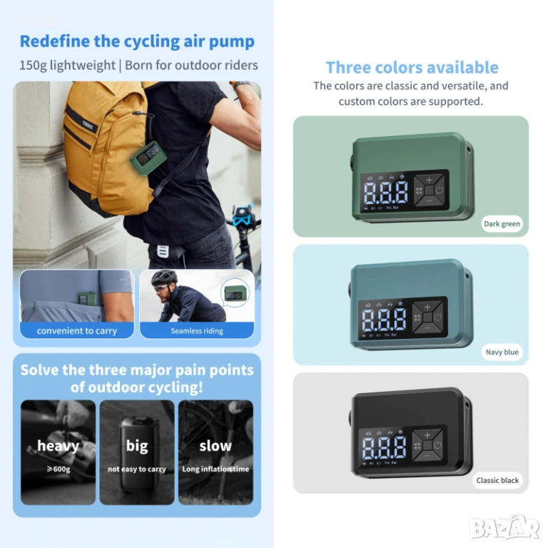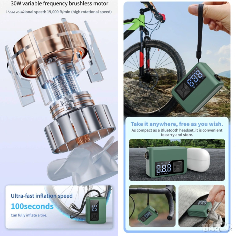 - Бърза инфлация: Оптимизираният безчетков механизъм осигурява висока скорост на напомпване въпреки малкия размер.