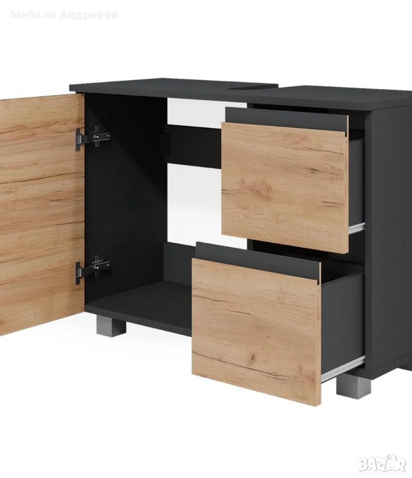 Шкафът е предназначен за монтаж под мивка тип „J-Shape“. Има голям ляв шкаф и две десни чекмеджета, осигуряващи удобно съхранение на препарати и принадлежности за баня. Изработен е от висококачествено ПДЧ с melamine покритие, устойчиво на влага и лесно за почистване. Цветът Sonoma с черни корпусни елементи придава модерен контраст и стилна визия.