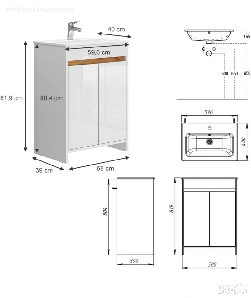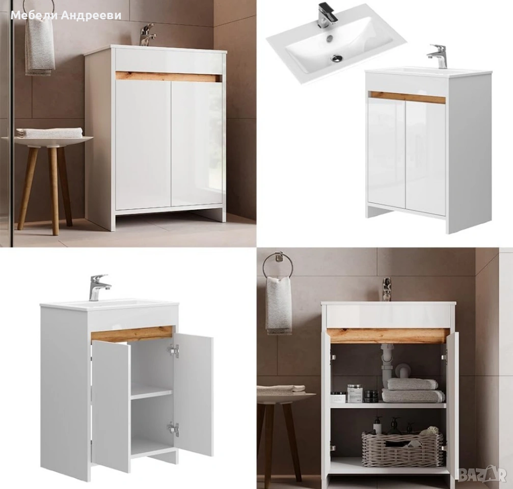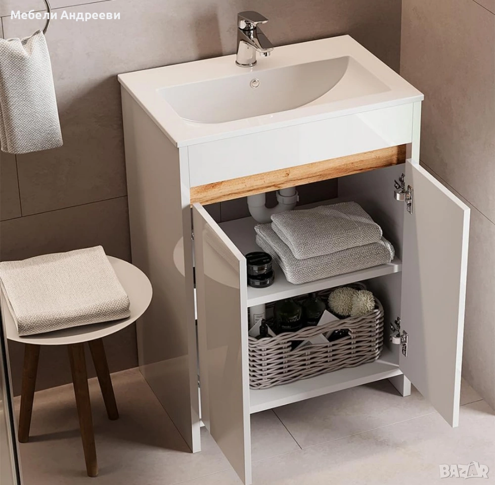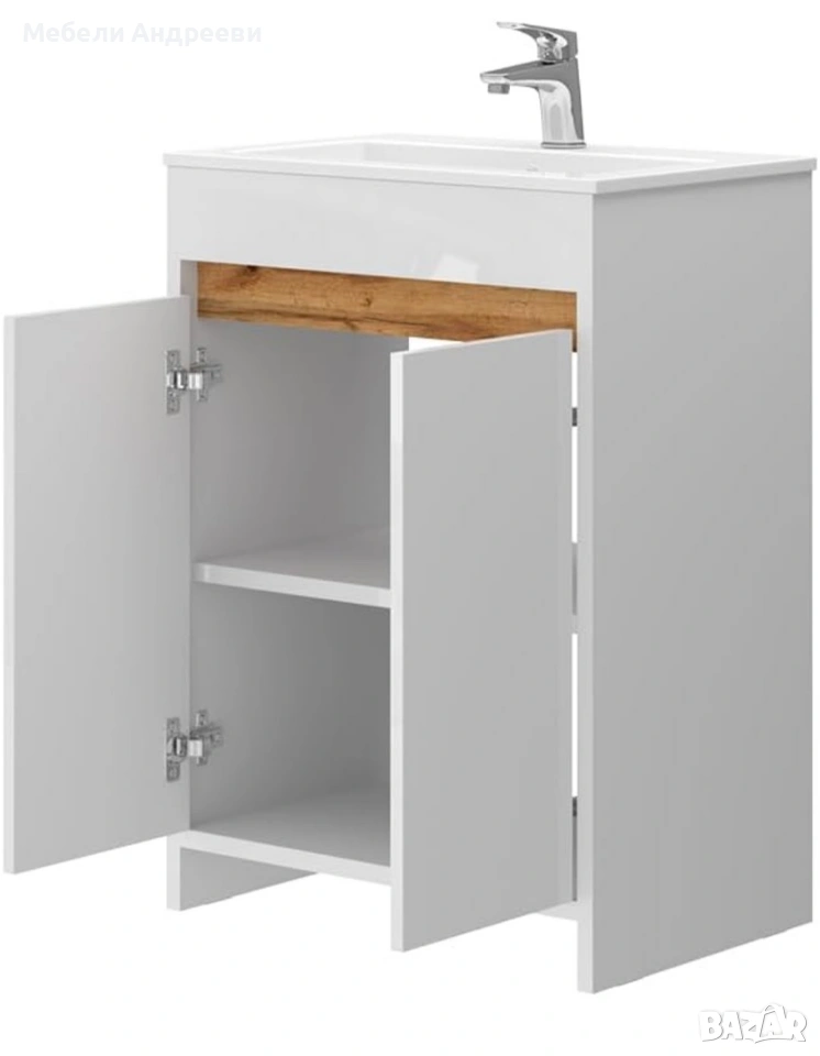 Шкафът е предназначен за монтаж под мивка (не е включена в комплекта). Разполага с две вратички и вътрешен рафт, което осигурява практично място за съхранение на козметика, препарати и аксесоари. ПДЧ материал с melamine покритие – устойчив на влага и лесен за почистване. Бял гланц и дървен акцент за по-топла и модерна визия.