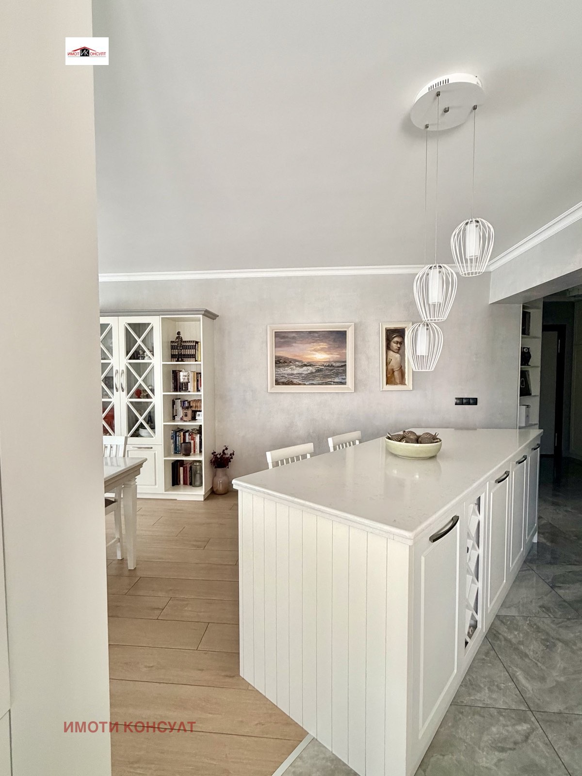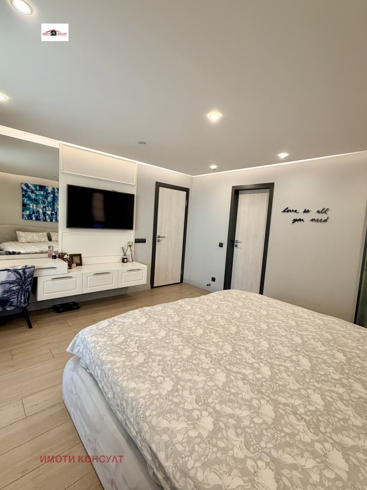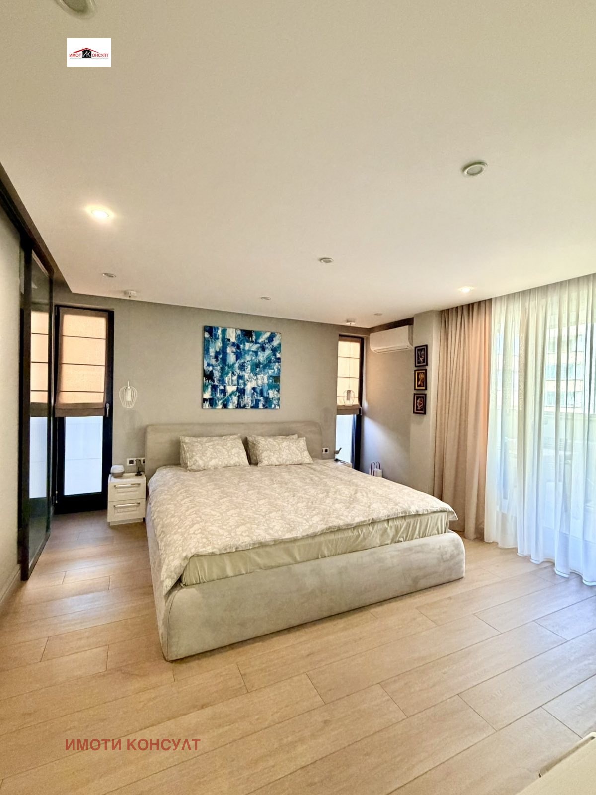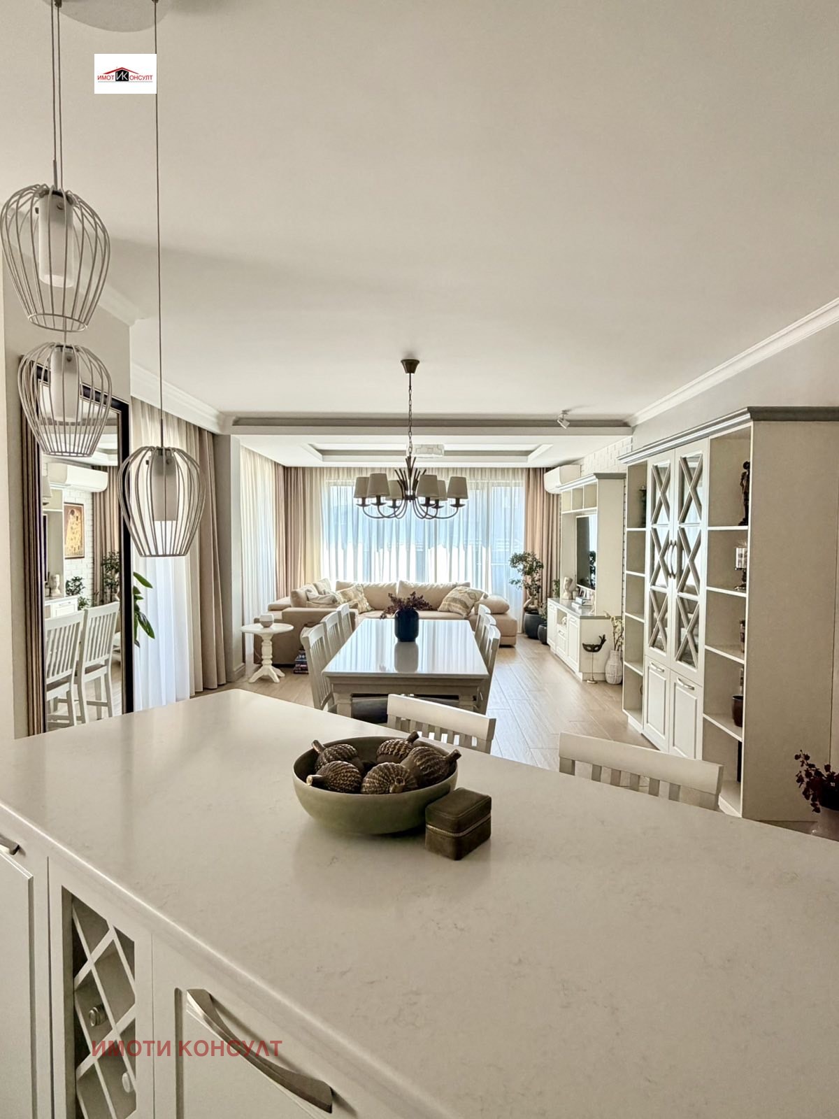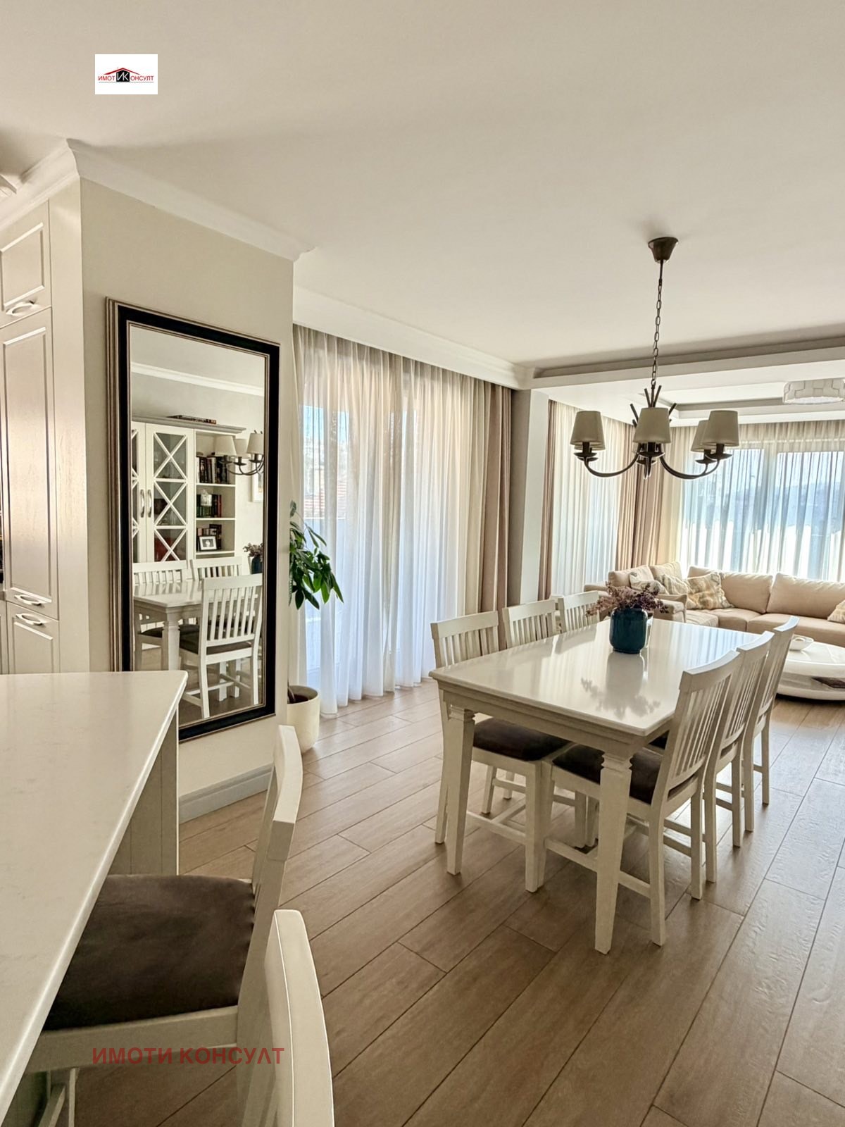 Агенция Имоти Консулт има удоволствието да Ви представи изключителен дизайнерски апартамент от висок клас, разположен в широкия център локация, съчетаваща бърз достъп до централната част на града, отлична инфраструктура и спокойствието на тиха жилищна улица. Районът е предпочитан за живеене поради близостта си до паркова среда, училища, магазини, заведения и всички необходими удобства на градската среда. Жилището е с обща площ от 172 кв. м, от които 155 кв. м чиста жилищна площ, и впечатлява със съвременно, изключително функционално разпределение, просторни помещения и висок клас изпълнение. Апартаментът разполага с просторно входно антре и коридор (10,4 кв. м), които отвеждат към впечатляваща дневна зона с кухня и трапезария (42,4 кв. м) светло и представително пространство, създадено като естествен център на дома. От дневната се излиза към голяма тераса с площ 16,1 кв. м, подходяща за зона за релакс и приятни моменти на открито. Жилището предлага две спални, както и отделно гардеробно помещение, което първоначално е било трета спалня и при необходимост може отново да бъде възстановено като самостоятелна стая. Двете спални са с площ 14,9 кв. м, а мастър спалнята (18,1 кв. м) разполага със самостоятелно гардеробно помещение (2,8 кв. м) с плъзгаща врата, собствена баня (5,4 кв. м) и излаз към самостоятелна тераса (7,4 кв. м), създавайки усещане за лична и уютна зона в дома. Апартаментът разполага още с втора баня с тоалетна (3,7 кв. м) и отделно мокро помещение (2,4 кв. м), което осигурява допълнителна практичност в ежедневието. Кухненската зона е оборудвана с висок клас вградени уреди Miele фурна, котлони и съдомиялна машина, а в мокрото помещение са разположени пералня Miele и сушилня Bosch, подбрани за надеждност, ефективност и дълготрайност. Отоплението в жилището е решено чрез газово подово отопление във всекидневната, коридора и баните, което осигурява равномерна топлина и комфорт, а в спалните са монтирани радиатори. Допълнително са инсталирани висок клас климатици Daikin във всекидневната и спалните, гарантиращи оптимален климат през всички сезони.Към имота се предлага самостоятелен гараж с площ 21 кв. м, към който има и складово помещение (5 кв. м) допълнително удобство и функционалност. Гаражът не е задължителна част от продажбата и при желание имотът може да бъде закупен и без него. Този имот е изключително предложение за ценители на модерната архитектура, качественото строителство и луксозното оборудване, предлагащ простор, функционалност и престижна градска локация дом, създаден за комфортен и стилен начин на живот. Ref.6306