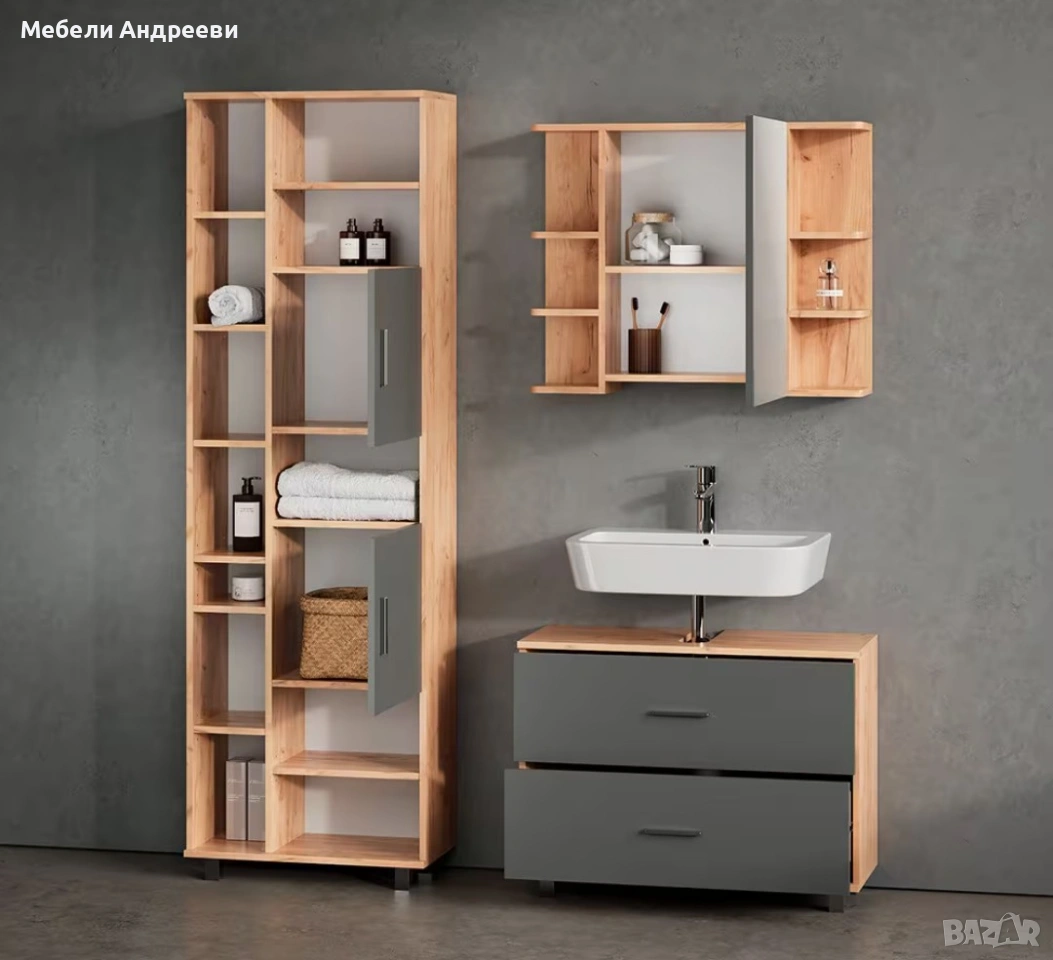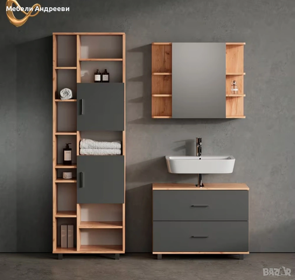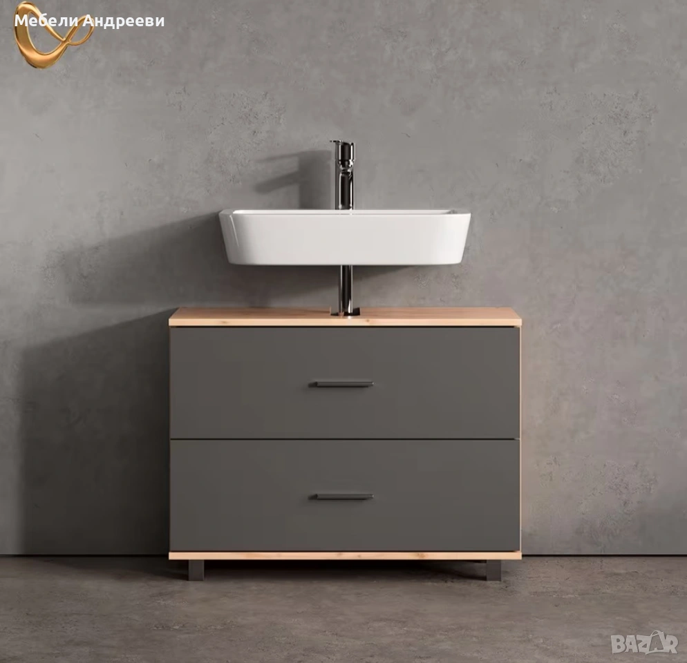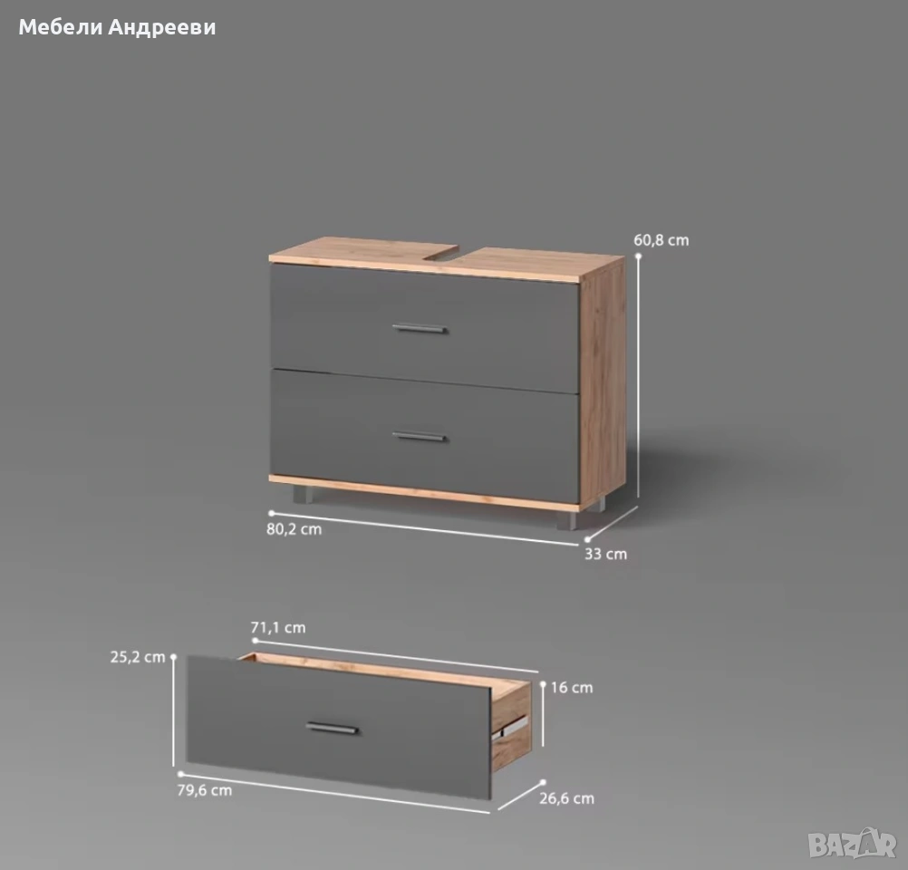 Шкафът комбинира модерни графитени фронтове с топъл дъбов корпус. Разполага с две големи чекмеджета, които осигуряват практично и подредено съхранение в банята. Плотът е с фабрично оформен отвор за сифон. Изработен е от висококачествено ПДЧ с melamine покритие – устойчиво на влага и лесно за поддръжка.