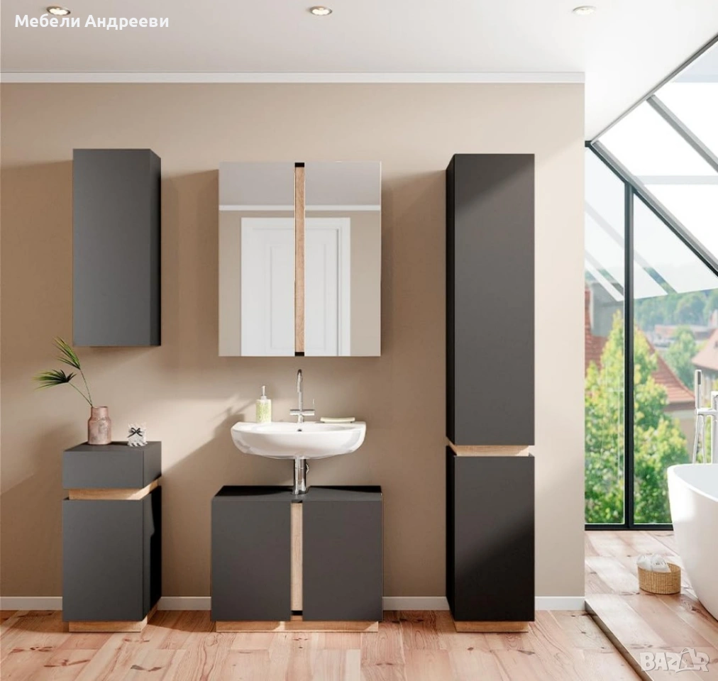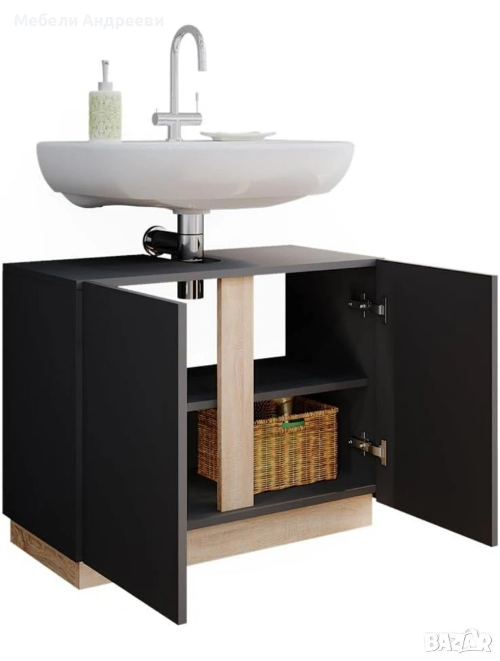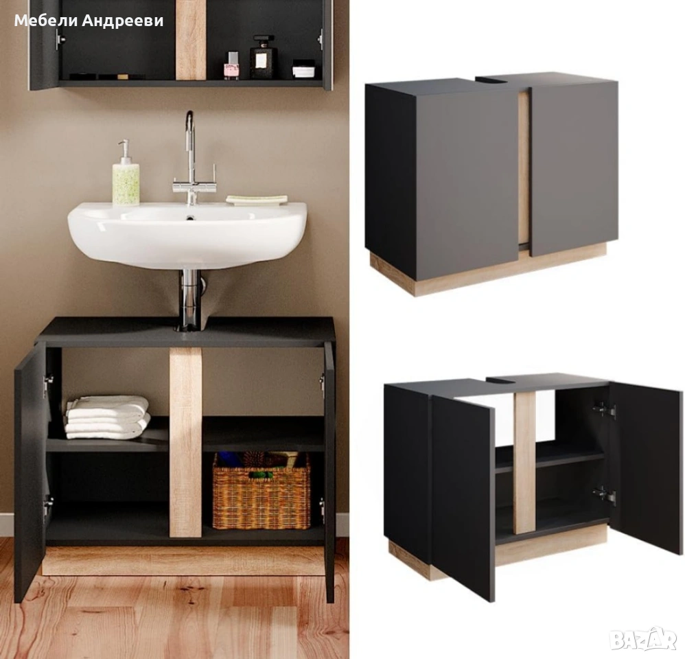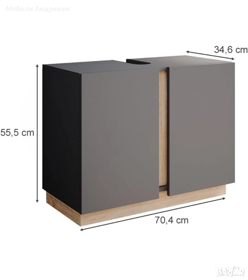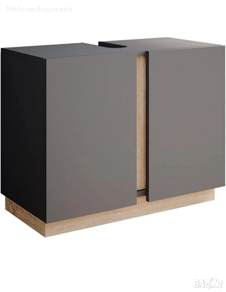 Шкафът предлага функционално решение за баня с широка вътрешна площ и удобни рафтове. Фронтовете са в модерен графит, а корпусът и декоративната средна лента са в топъл дъб. Плотът е с оформен отвор за сифон. Изработката е от висококачествено ПДЧ с melamine покритие, устойчиво на влага и лесно за поддръжка.