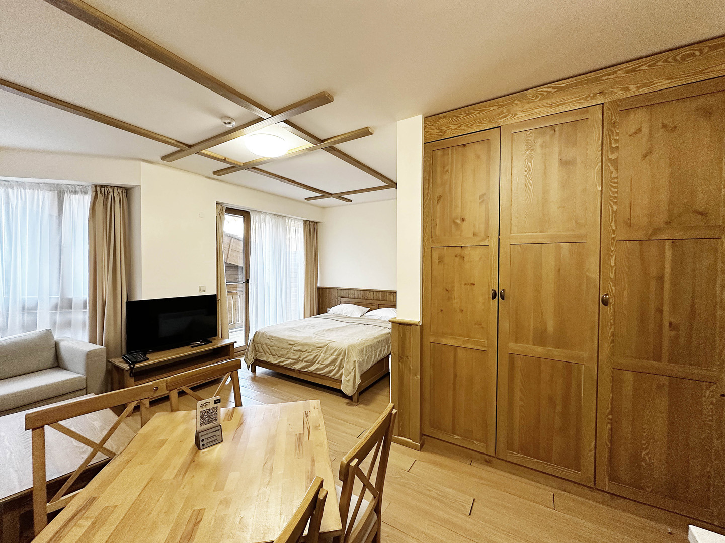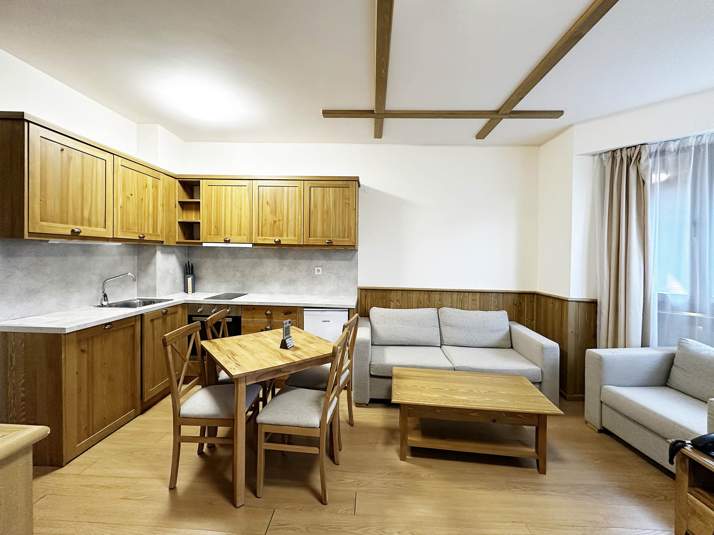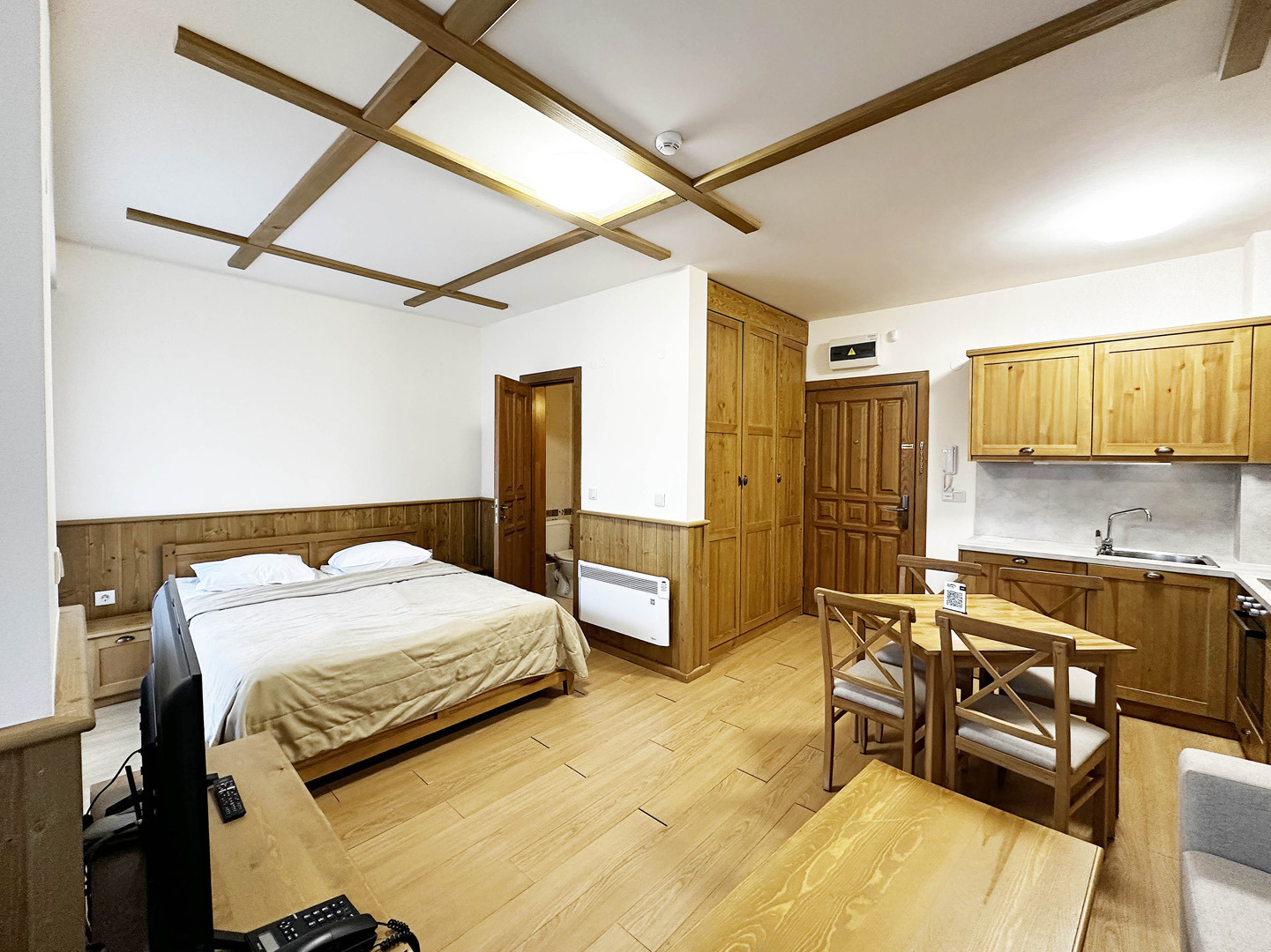 Студиото се предлага напълно обзаведено с кухня, мека мебел, двойно легло, телевизор с телевизионен шкаф и гардероб. Банята е оборудвана с вана. Имотът има тераса.