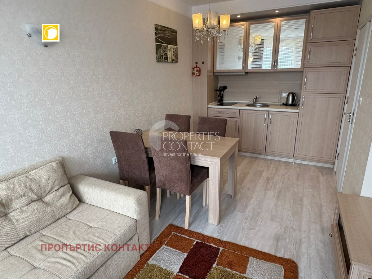 Предлагаме за продажба комфортен двустаен апартамент в комплекс Harmony Suites 11, разположен в една от най-предпочитаните части на курорт Слънчев бряг, България. Имотът е отличен избор както за ваканционен дом, така и за инвестиция с възможност за отдаване под наем в популярен морски курорт. Апартаментът е с обща площ 48 кв.м и се намира на четвърти етаж в добре поддържана сграда с Акт 16. Жилището е функционално разпределено и предлага удобна жилищна среда. Разпределение на имота входно антре всекидневна с кухненски кът и зона за хранене самостоятелна спалня баня с тоалетна и душ кабина тераса Апартаментът се предлага напълно обзаведен и оборудван, което позволява незабавно ползване или отдаване под наем през летния сезон. Интериорът е практичен и уютен, създаващ приятна атмосфера за почивка. Удобства в комплекса Harmony Suites 11 Комплексът е известен със своята модерна концепция и добре поддържана среда. На разположение на собствениците са: открит басейн с шезлонги красиво озеленени градини ресторант и pool bar фитнес център масажни услуги денонощна охрана видеонаблюдение контролиран достъп професионална поддръжка на общите части Сградата е добре управлявана и поддържана през цялата година, което осигурява комфорт и спокойствие на собствениците. Локация Комплексът се намира в централната част на Слънчев бряг, само на около 800 метра от плажа и морето. Районът разполага с отлична инфраструктура и бърз достъп до всички удобства на курорта. В близост ще откриете: супермаркети и магазини аптеки и медицински център автобусна спирка и автогара ресторанти и заведения бързи закуски увеселителен парк и разнообразни развлечения плажната ивица Благодарение на доброто местоположение, удобствата в комплекса и готовото обзавеждане, този имот е привлекателна възможност за покупка на апартамент в Слънчев бряг, България – както за лично ползване, така и за инвестиция.