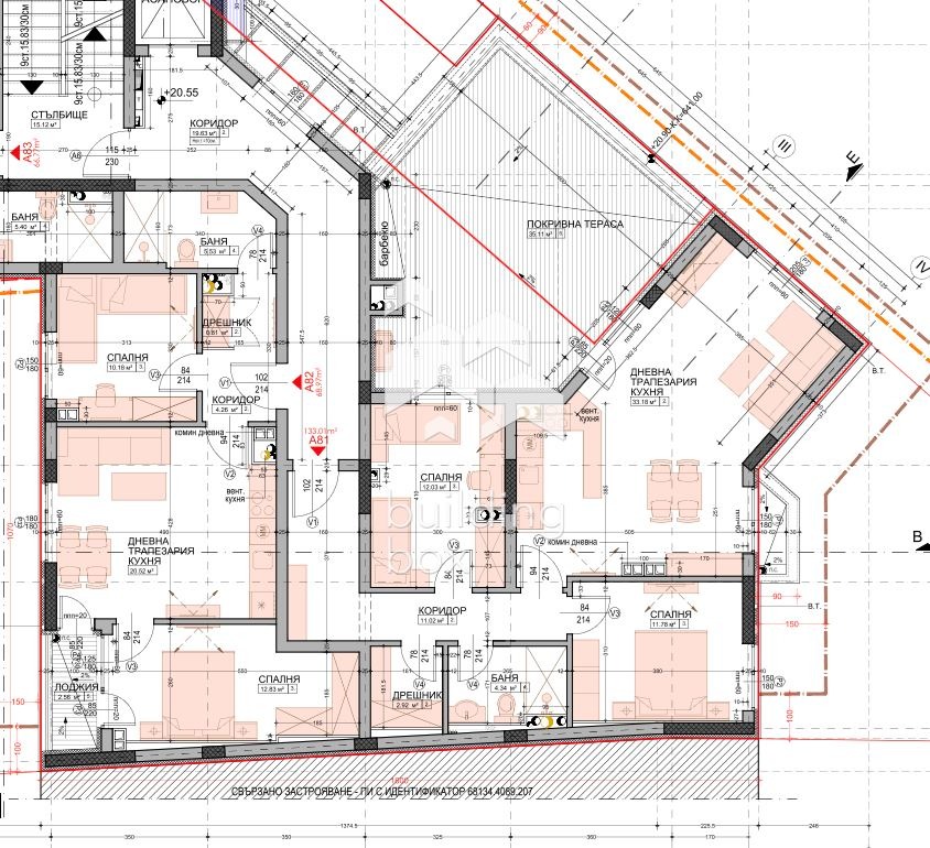 Имотът е със застроената площ е 102.29 кв.м., а разпределението му е както следва: входно антре, дневна с кухненски бокс, две спални, баня с тоалетна, гардеробна и тераса 35 кв.м. с барбекю. Изложението на имота е югоизток и северозапад. Намира се на 8-ми етаж от общо 9. Отоплението е на ТЕЦ.