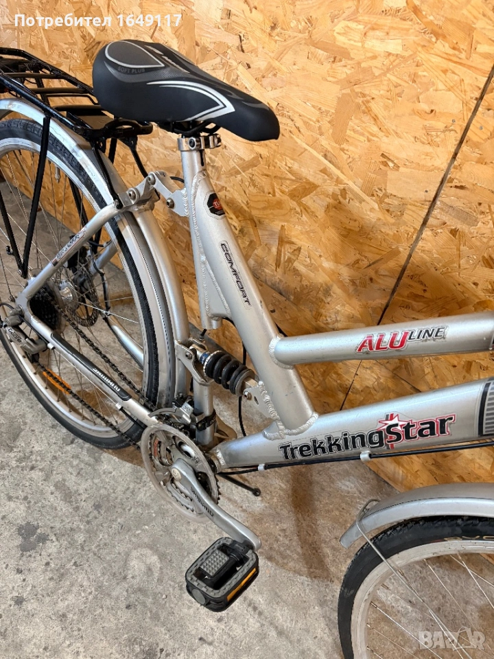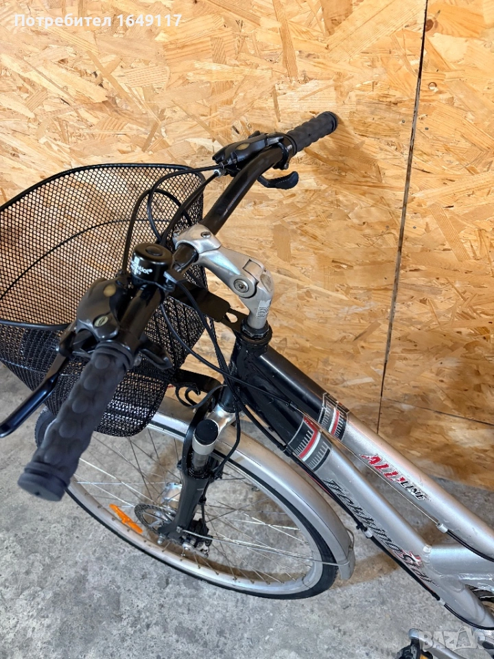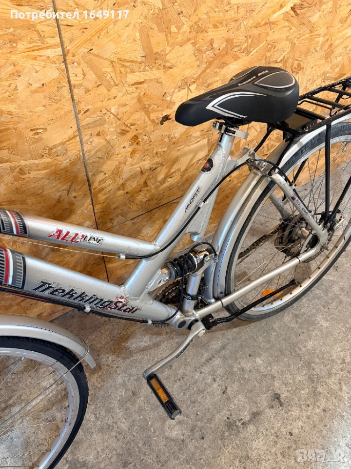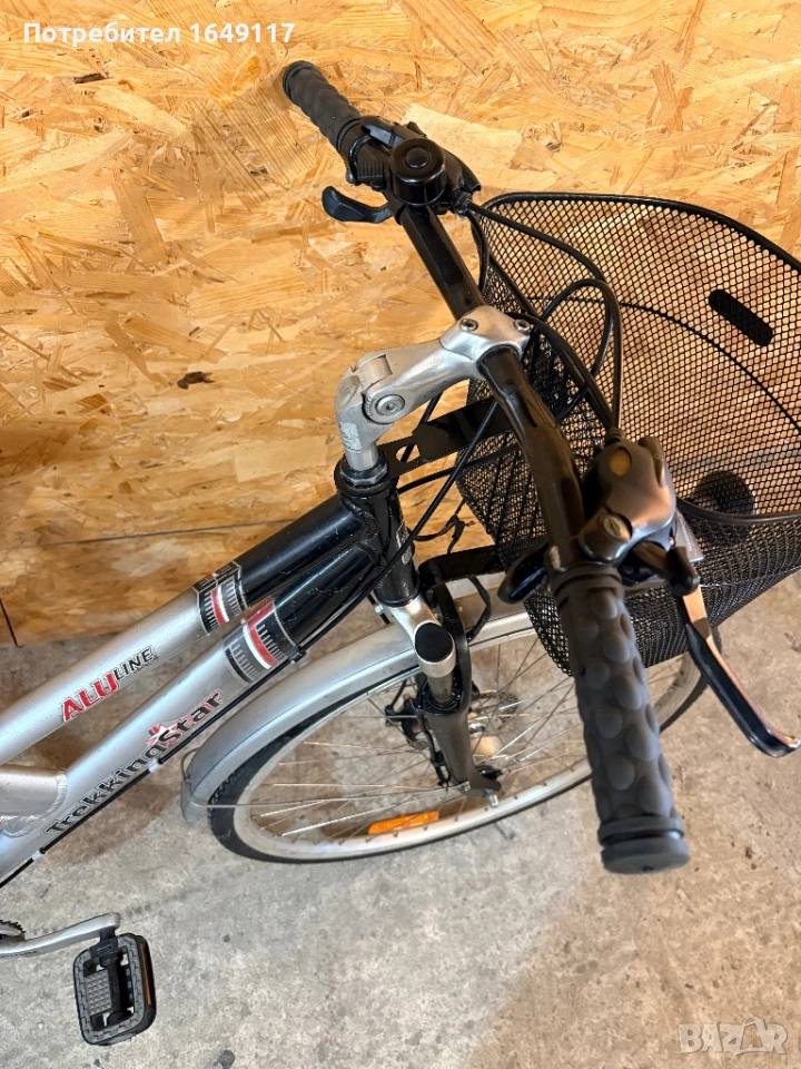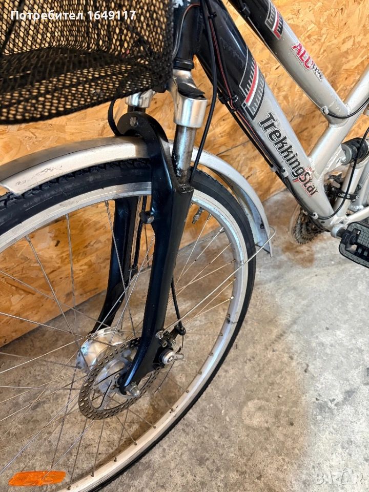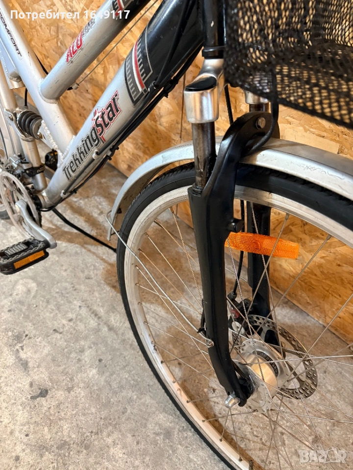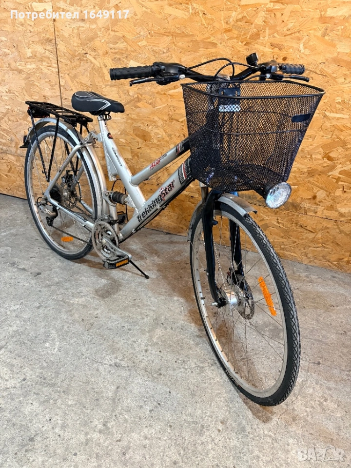 Продавам 28цола, малко употребяван, дамски-градски велосипед Trekking Star ALU line[made in Germany]. Олекотена, алуминиева рамка - 52см. Външни скорости Shimano Deore - 24бр. c комбинирани палцови команди Shimano. Предна, алуминиева-амортисьорна вилка. Централен амортисьор с регулиране на твърдостта. Алуминиеви курбели Shimano. Спортна ергономична седалка. Алуминиеви, двойностенни капли[предна капла с динамо главина]. Гуми с усилен градски профил. Предна и задна дискови спирачки ProMax. Кормило с алуминиева, раздвижна лапа. Заден багажник с натоварване до 25г + кошница за багаж отпред. Олекотени калници. Алуминиева стойка. Халогенен фар и габаритна светлина, светлоотразители, звънец.