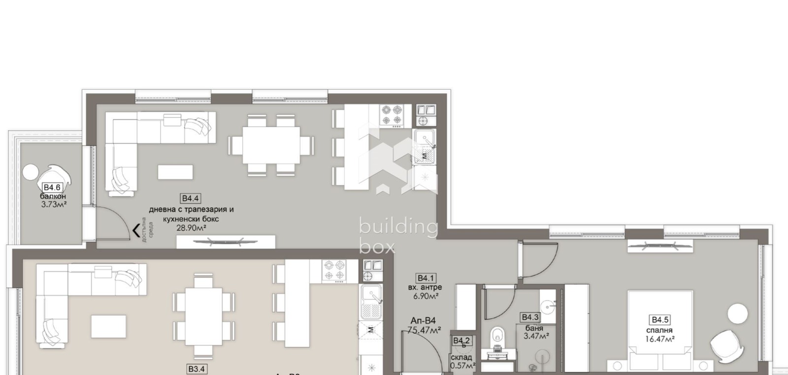 БИЛДИНГ БОКС представя сграда, която се отличава с просторни жилища с перфектно разпределение, нисък процент общи части и високо качество на строителството, изпълнено от опитни професионалисти, които осигуряват сигурност и комфорт за бъдещите обитатели.