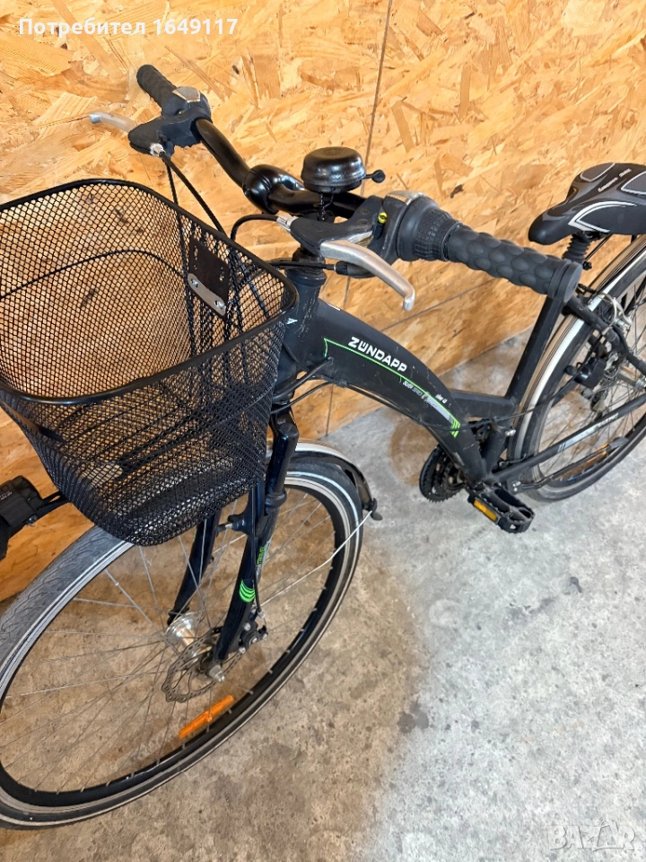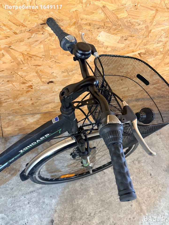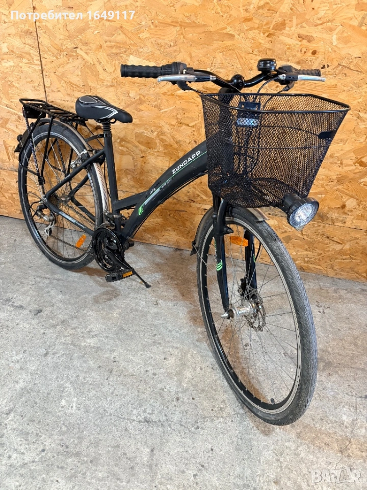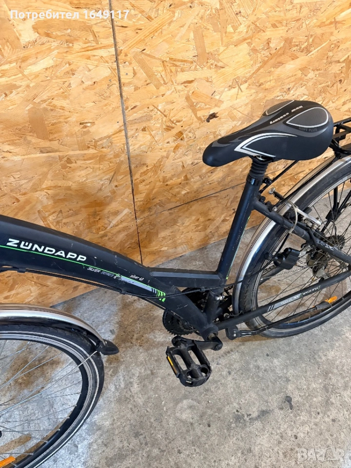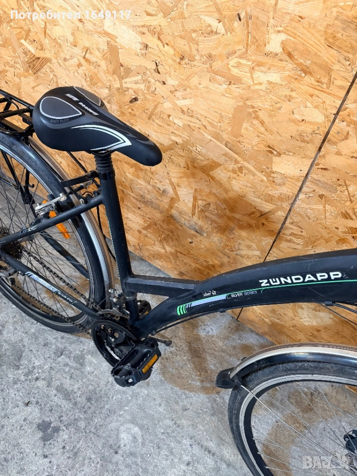 Продавам 28цола употребяван, дамски-градски велосипед Zundap Silver 4.0[made in Germany]. Олекотена, алуминиева рамка - 46см. Външни скорости Shimano Acera - 21бр. c revo shift команди Shimano. Предна амортисьорна вилка. Алуминиеви курбели. Спортна ергономична седалка с амортисьорно колче. Алуминиеви, двойностенни капли Euro Line. Гуми с усилен градски профил. Предна дисковa спирачкa + задна алуминиева V-break спирачка. Кормило с алуминиева, раздвижна лапа. Заден, алуминиев багажник с натоварване до 25г + кошница за багаж отпред. Олекотени, пластмасови калници. Алуминиева стойка. Халогенен фар и габаритна светлина с динамо, светлоотразители, звънец.