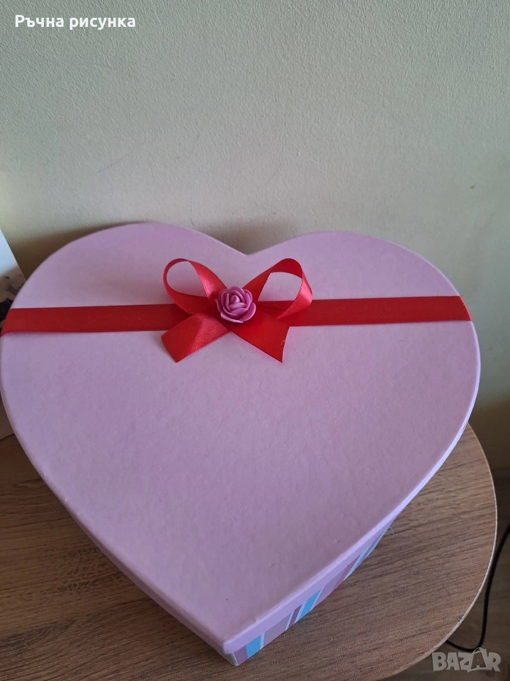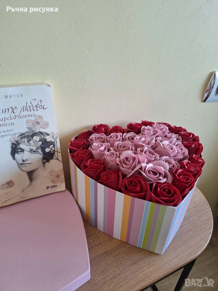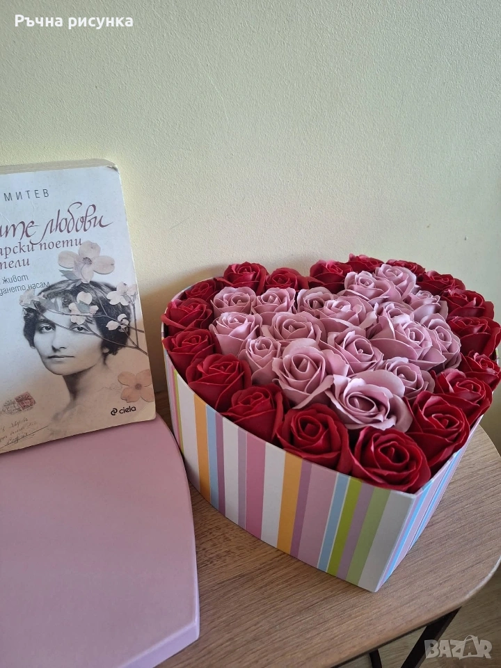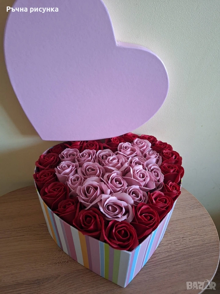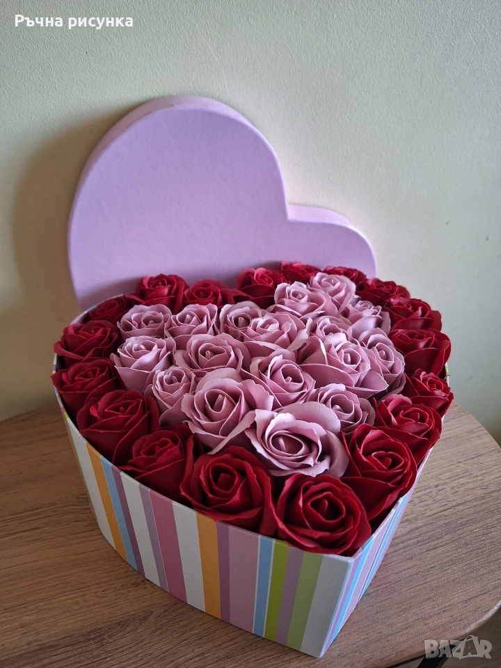 Кутия с капак форма сърце и в нея 35 броя сапунени рози