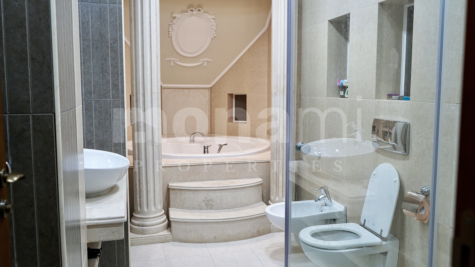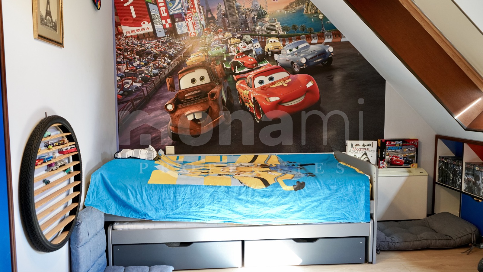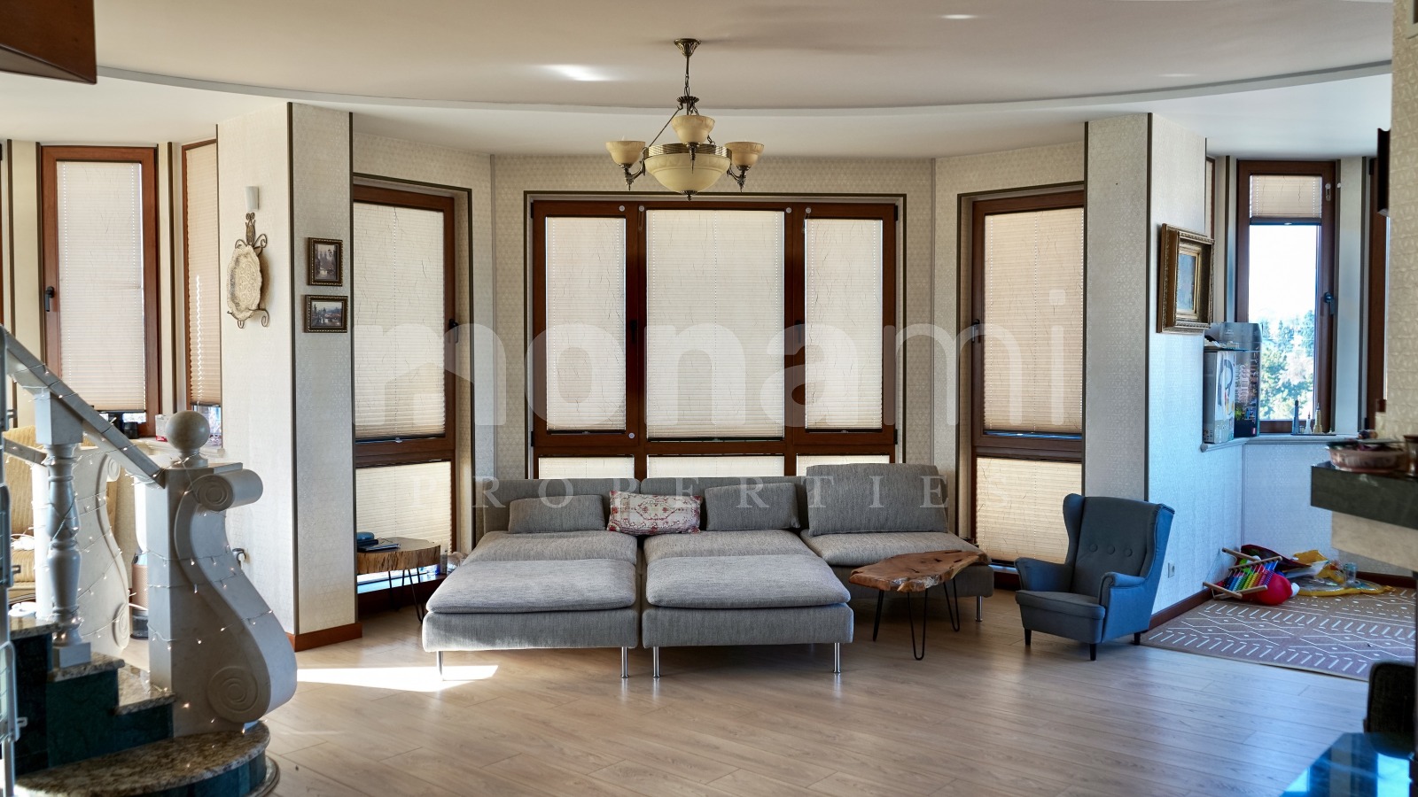 Имотът е със следното разпределение: входно антре, което ни отвежда в трапезарията, където е и кухненският бокс, в тази част има и обособен кът тип библиотека за четене. Огромна дневна с работеща камина, две детски спални, споделящи една баня, склад. Мастър спалня с дрешник и голяма баня към нея, в която се намира и приказната вана тип джакузи. Горният етаж на апартамента е обособен като библиотека/киносалон. От там се излиза на приказна тераса с фонтан, беседка, барбекю и спираща дъха 360 градусова гледка.