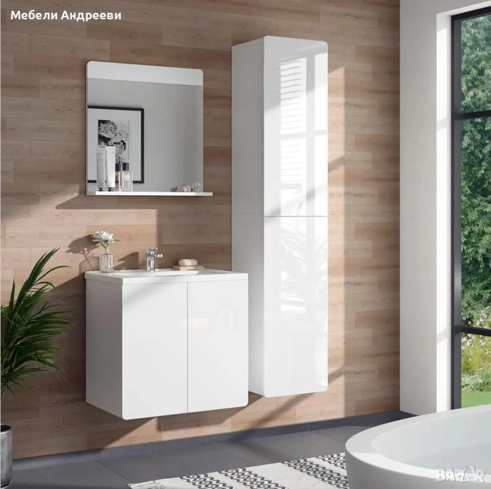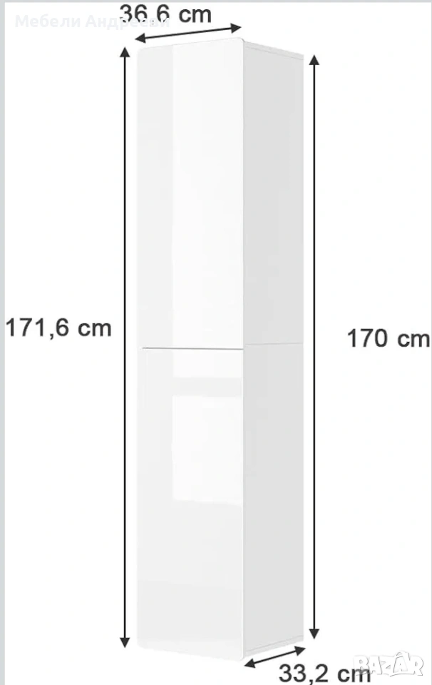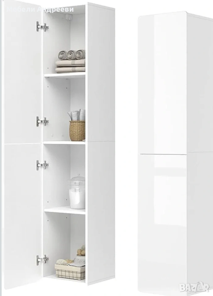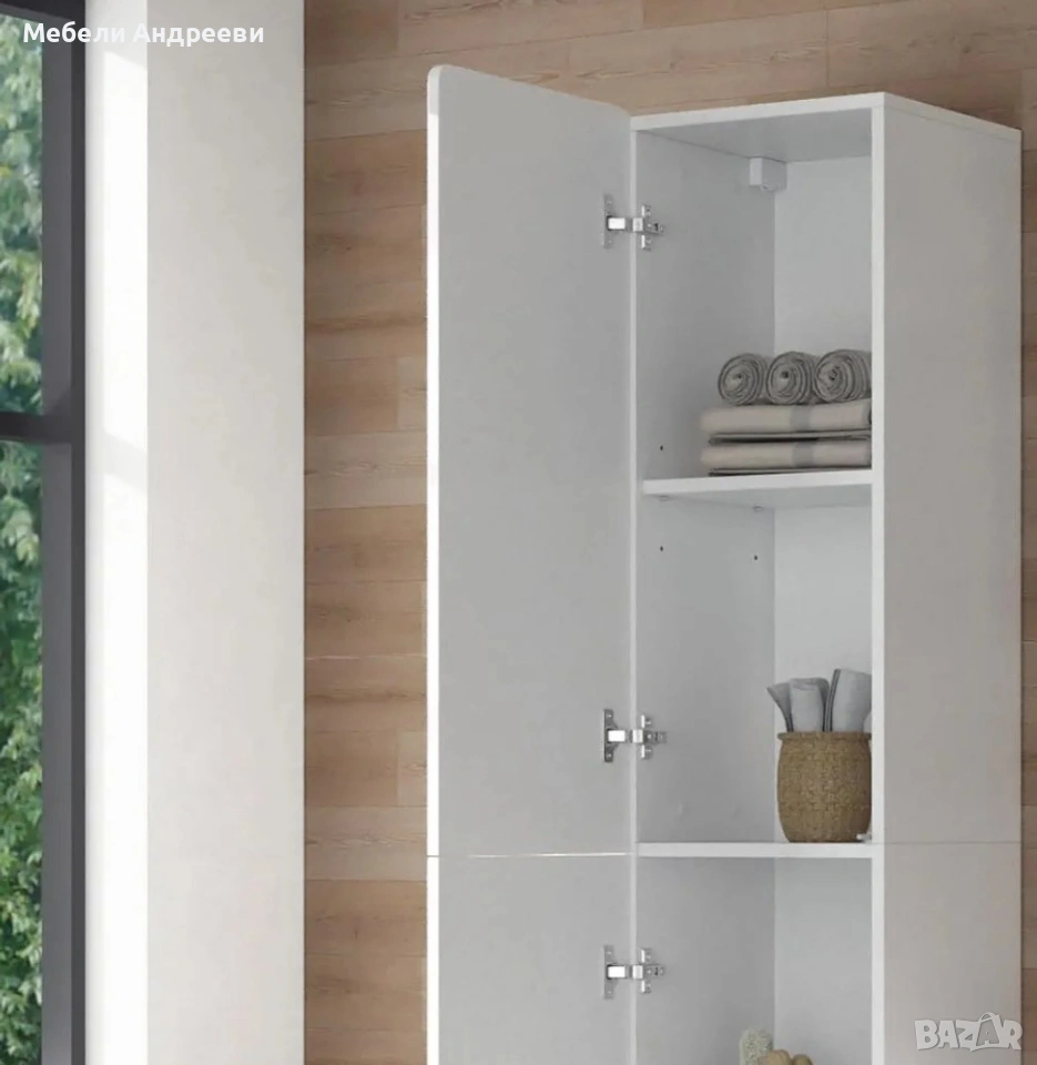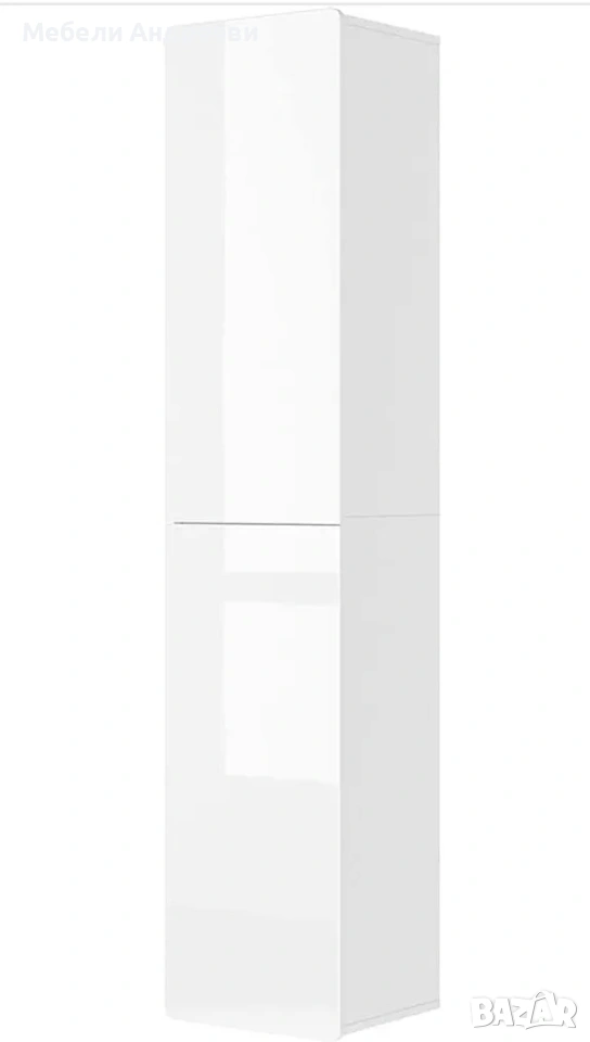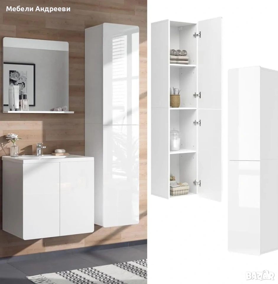 Шкафът е висок и практичен, подходящ за всяка баня. Разполага с горен и долен шкаф с плавно отваряне и достатъчно място за козметика, препарати и аксесоари. Изработен е от качествено ПДЧ с устойчиво melamine покритие, а фронтовете са с бял гланц за по-елегантна визия. Конструкцията е стабилна и добре защитена от влага.