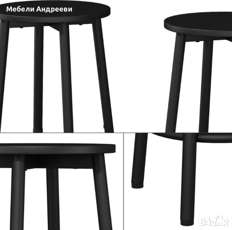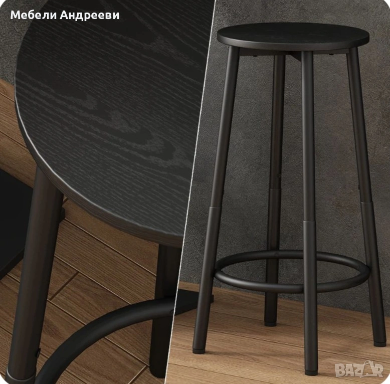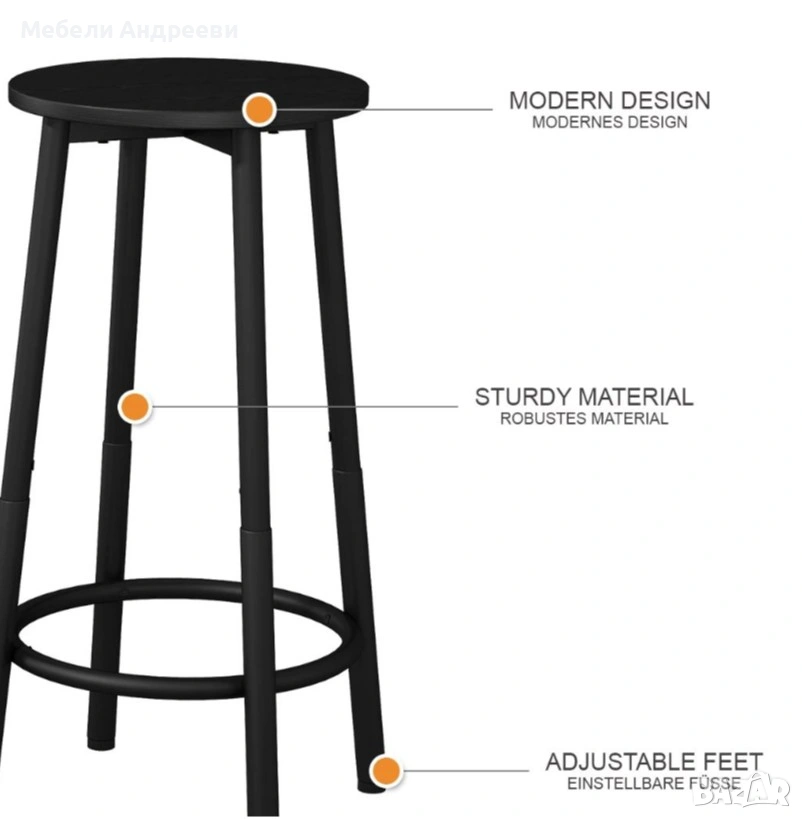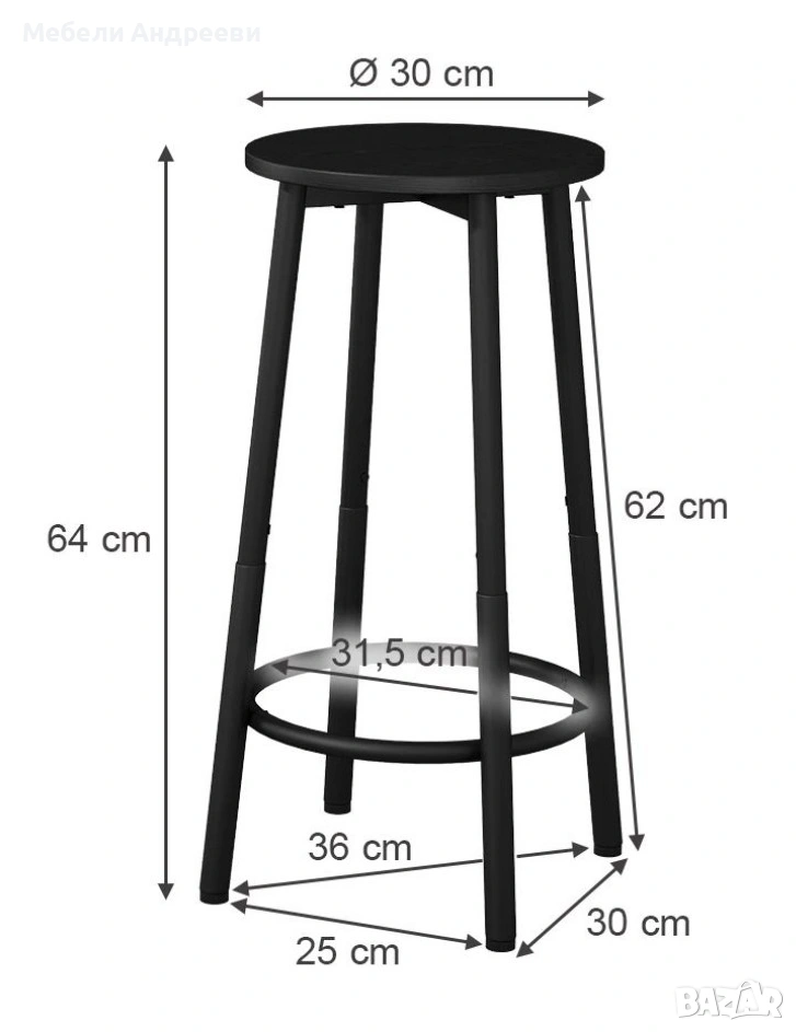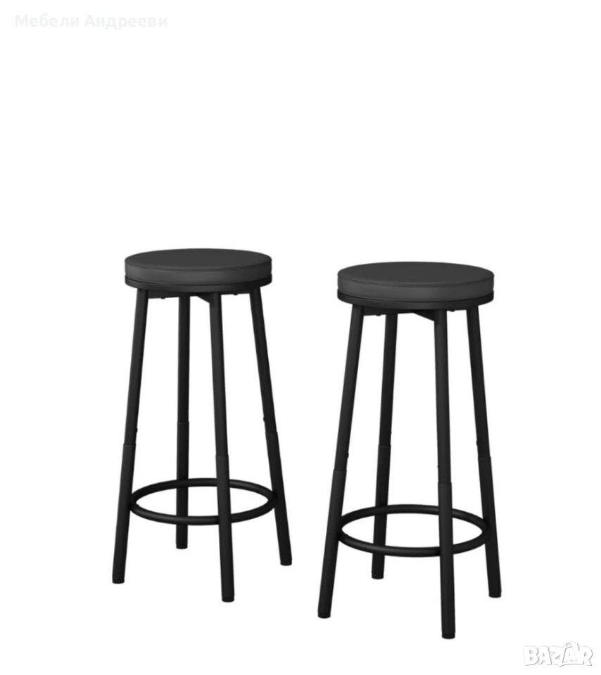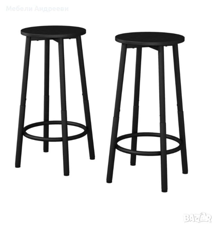 Комплектът включва два бар стола с изчистена кръгла седалка и стабилна метална конструкция. Черният прахово боядисан метал осигурява здравина и устойчивост при ежедневна употреба. Кръглата опора за крака и регулиращите се накрайници гарантират комфорт и стабилност върху всякакъв под. Подходящи са за бар плот, кухня, заведение или търговски обект.