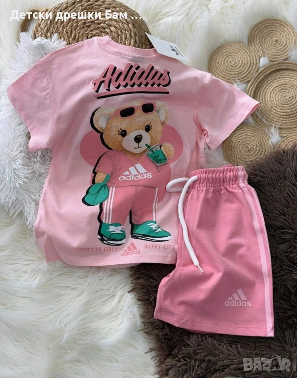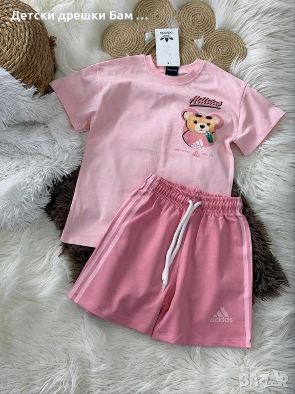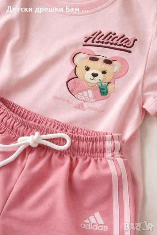 Сладък розов комплект за момиче – тениска с мече и къси панталонки