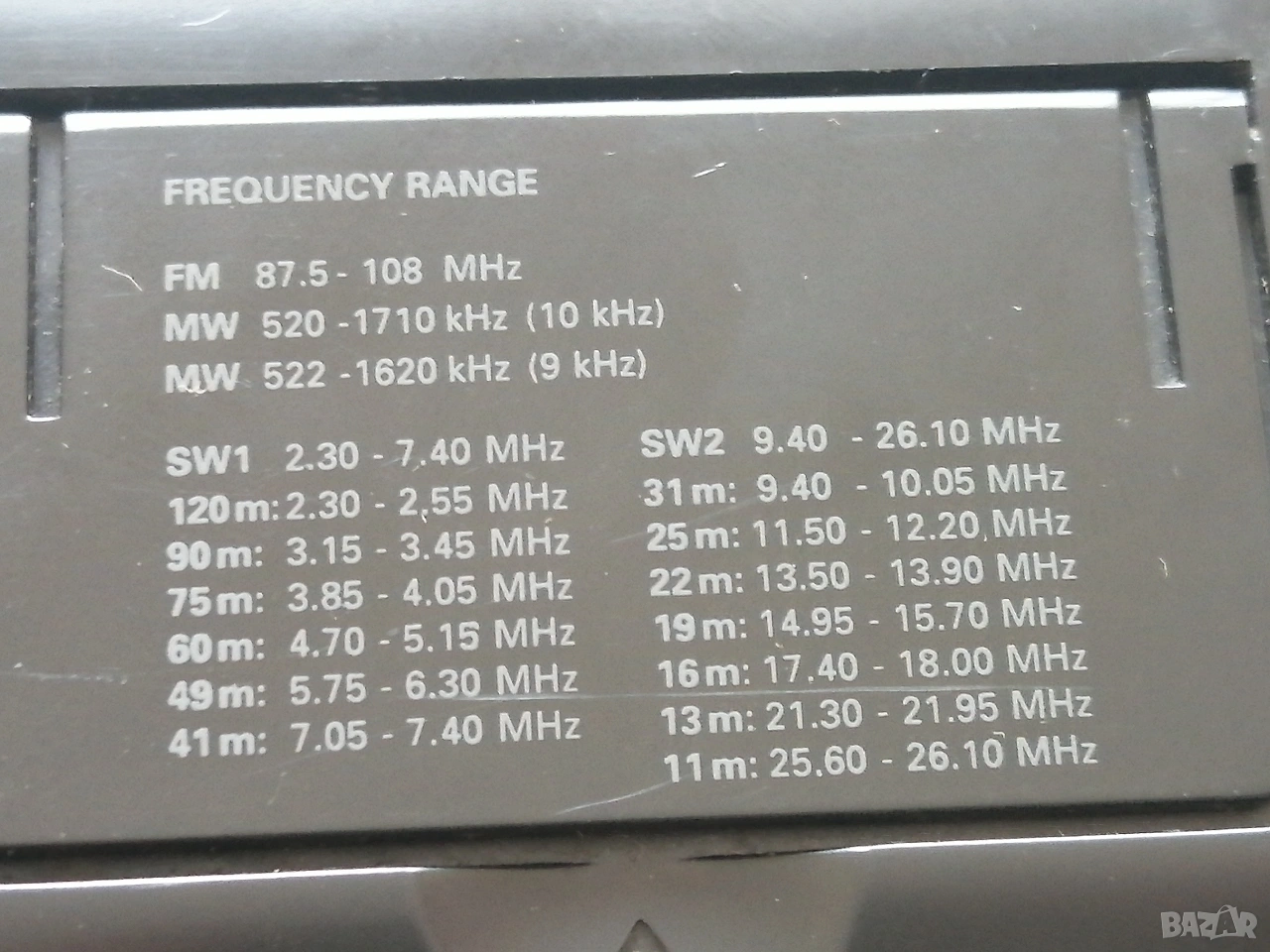 Устройството е оборудвано с FM (стерео със слушалки), MW (AM) и 13 късовълнови диапазона.