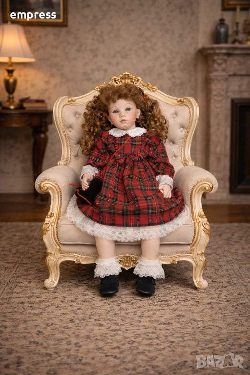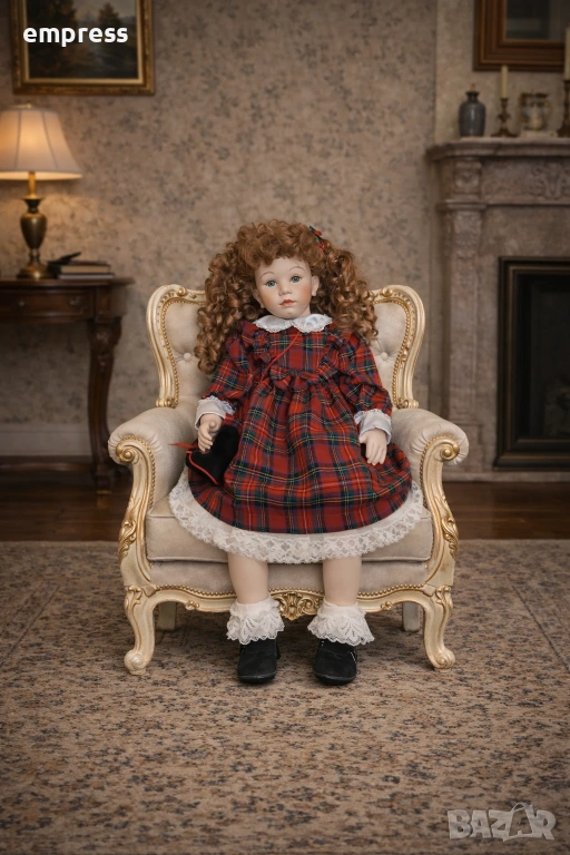 косата е дълга, гъста и оформена в красиви къдрици, които рамкират лицето и допълват класическата ѝ визия. Облеклото е изработено от качествени материи – елегантна рокля в червено каре, украсена с фини дантелени елементи и бяла яка, които придават на куклата винтидж чар и усещане за стара английска традиция.