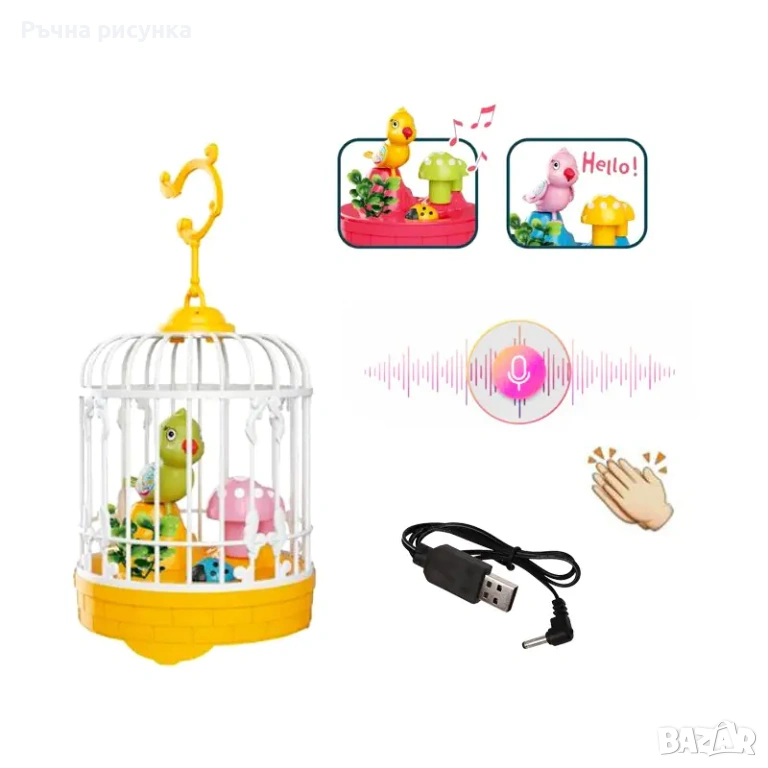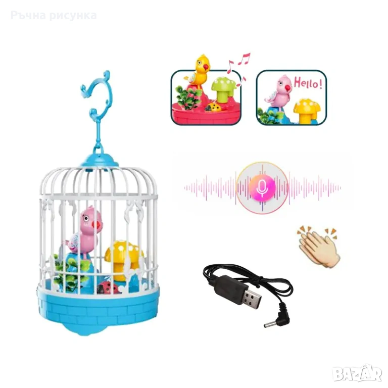 Интерактивна играчка „Пееща и повтаряща птичка в клетка“, която предлага забавни и образователни функции за деца. Продуктът е снабден със звуков сензор и се зарежда чрез USB кабел.