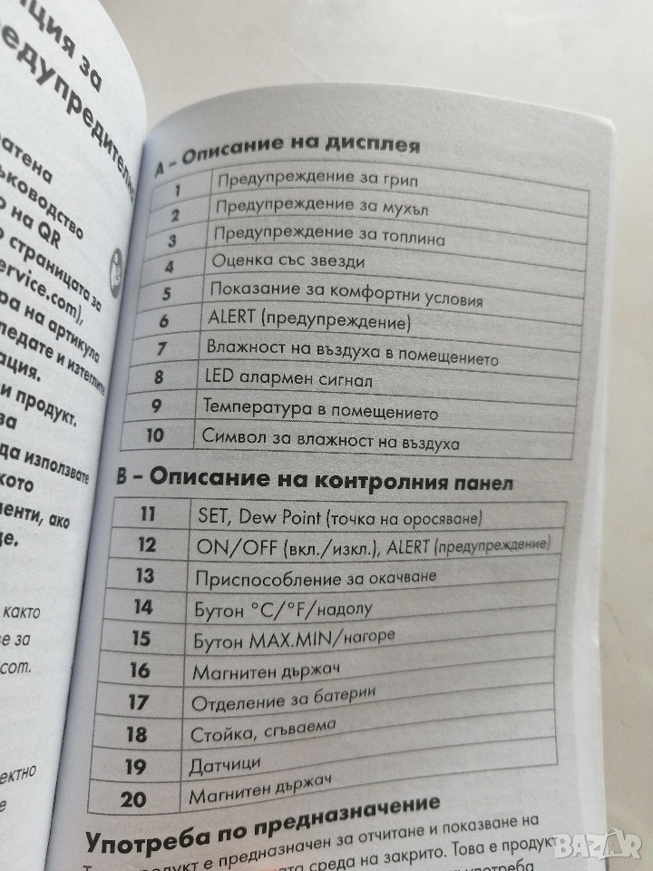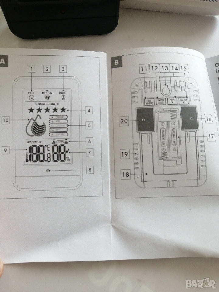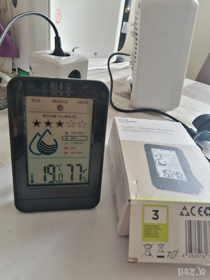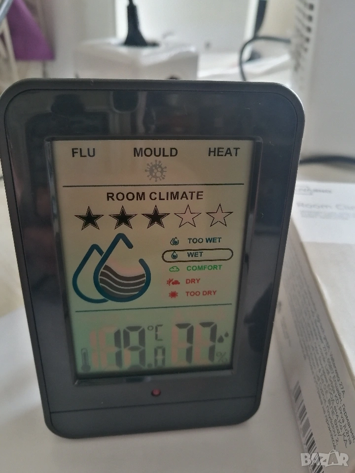 Термометър и влагомер с предупреждение за влага, мухъл, сух въздух.