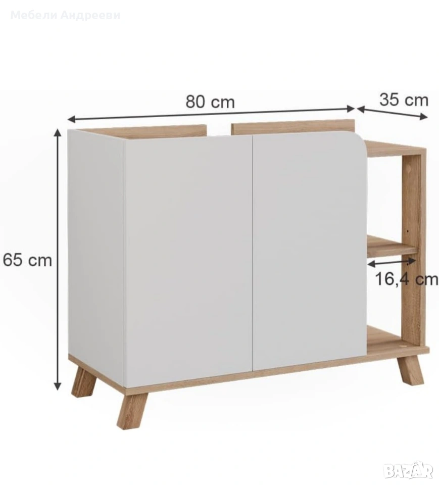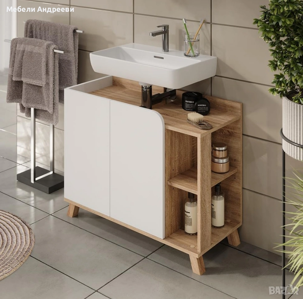 шкаф под мивка, шкаф за баня, сканди стил, дъб шкаф, бяло шкафче, Vicco, отворени рафтове, шкаф с крака, мебели за баня, немски мебели, внос Германия