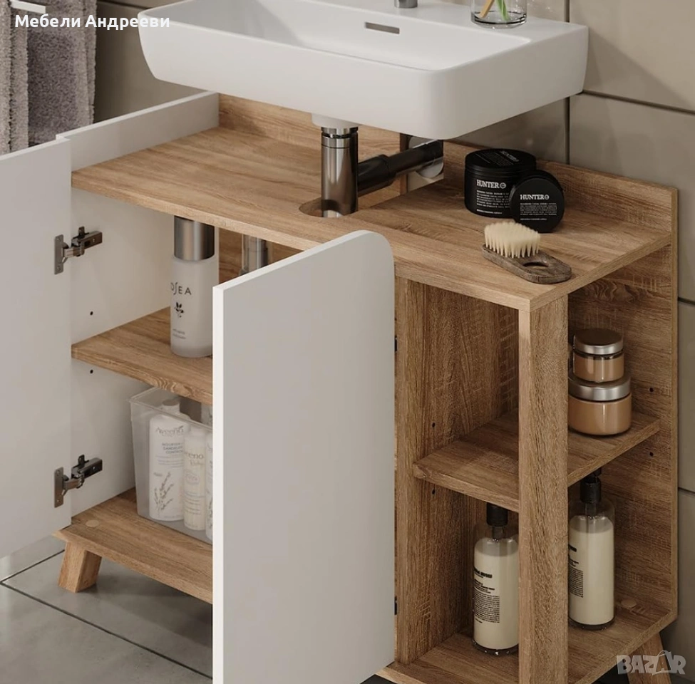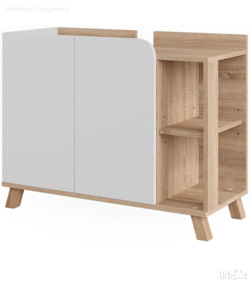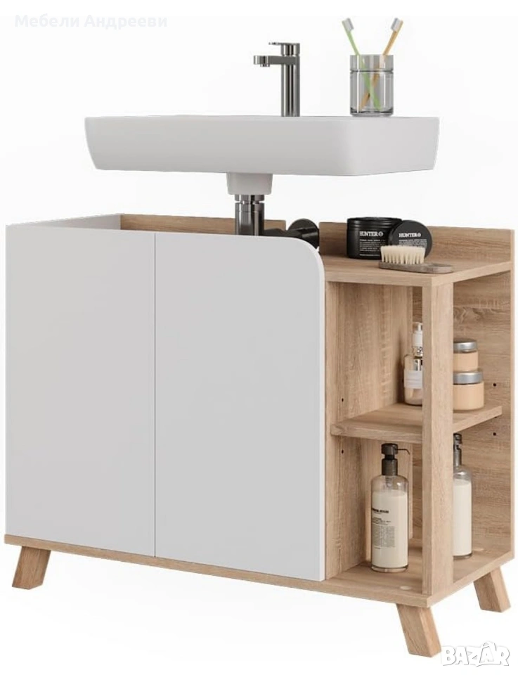 Шкафът под мивка е изпълнен в комбинация от дъбов корпус и бели фронтове. Има изрязана задна част за сифона и широк вътрешен обем за съхранение на препарати и принадлежности. Отдясно разполага с три открити рафта, удобни за ежедневно ползване – козметика, кърпи, бутилки, бурканчета. Стои стабилно на дървени крака и придава модерен сканди стил на банята.